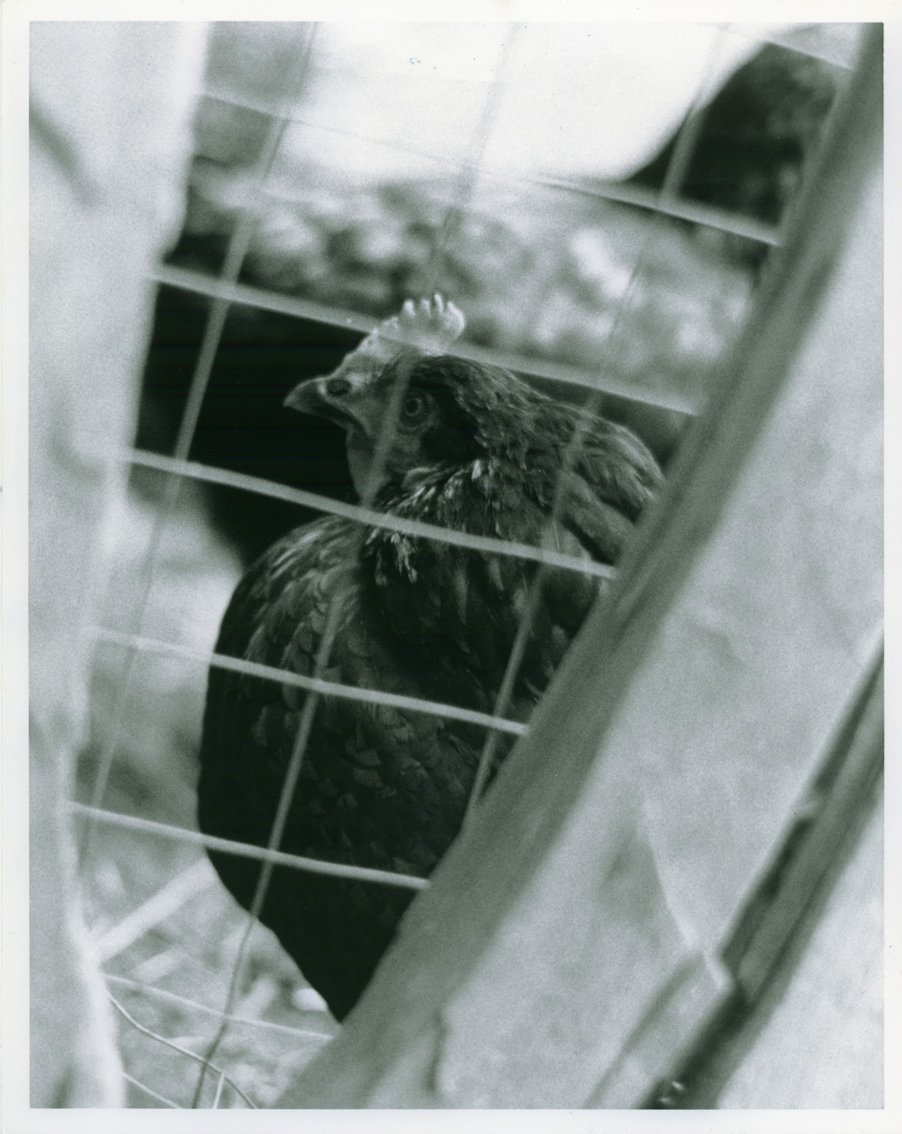 I have to appologize for the quality of the scans, my scanner is giving me poor results recently. There should be more details in the lights with the chicken. I had another reason to get into the darkroom, I needed two prints for demos in class. I do this project called strip composition. The prints are cut up into regular intervals and glued back together. This year I decided to print images of birds; a chicken and a whiskey jack (aka gray jay).