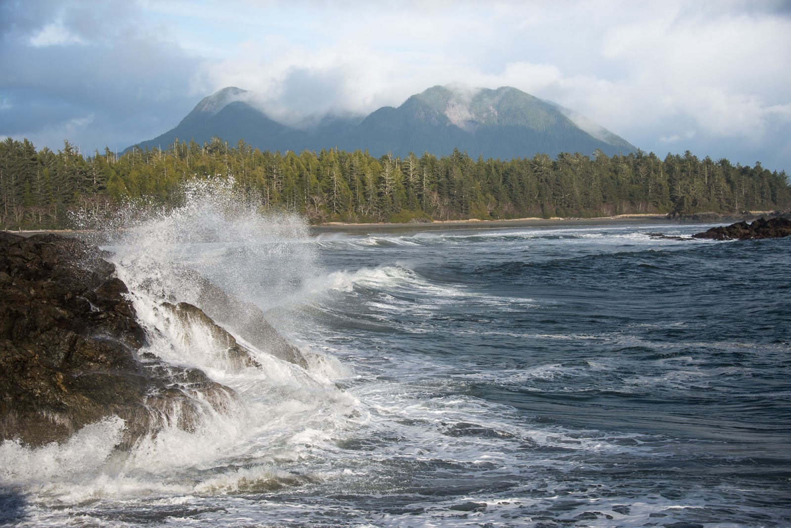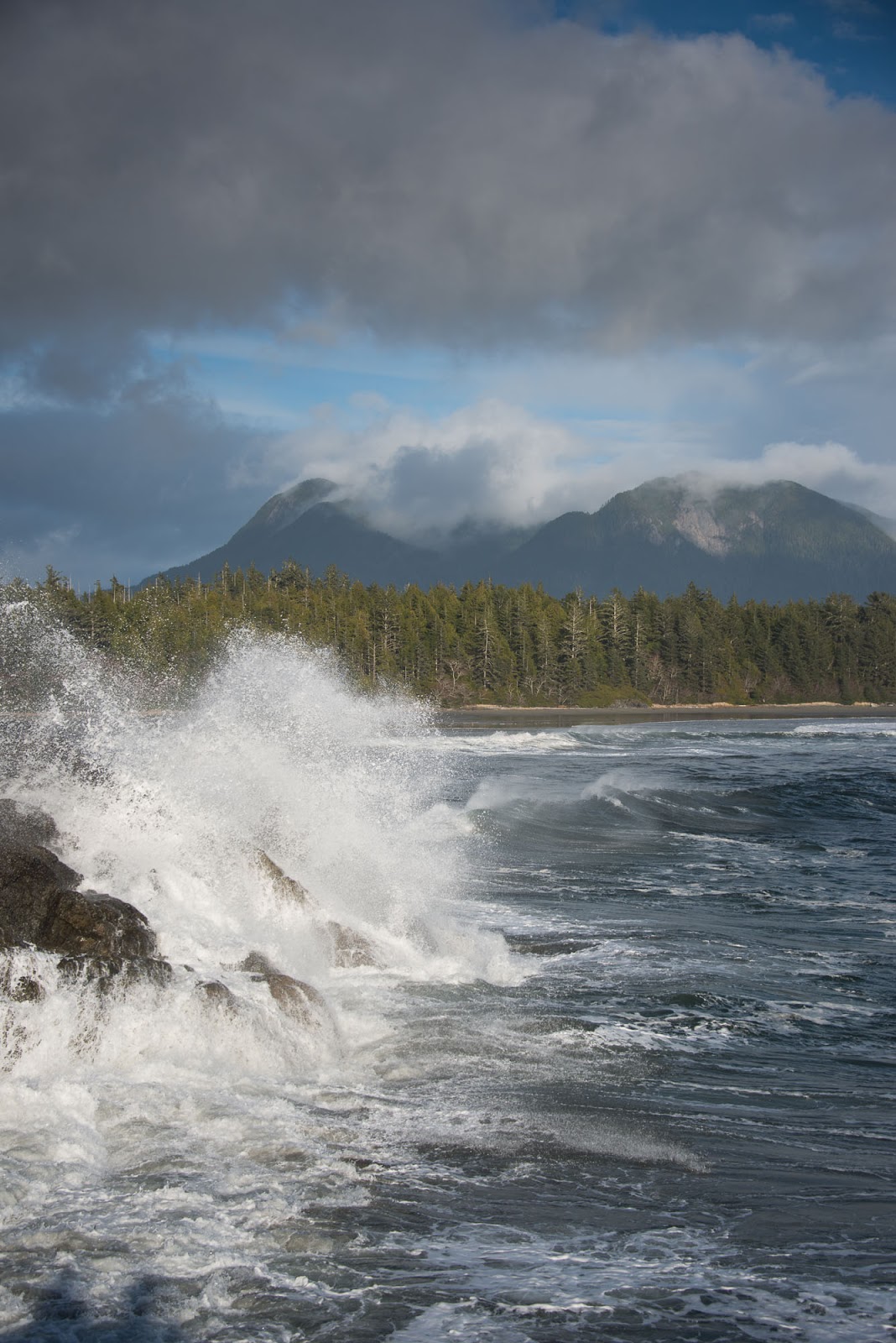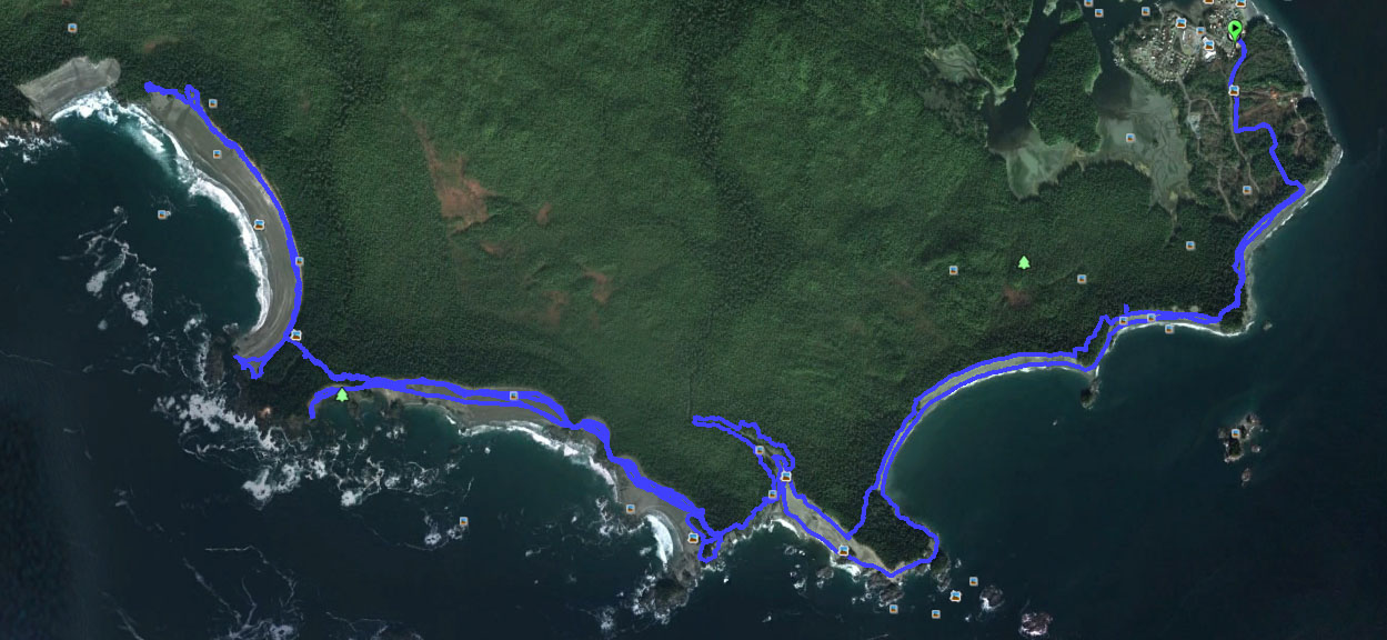 Fortune would have it that the walks along side the cabin, taking no effort to locate. We made our home for two nights at the cabin, using it as a home base for cooking, sleeping and excursions. The first day we ventured to reach Cow Bay but the water on the trails for the headlands slowed our progress so much that we feared not being able to return to the cabin if we continued across the final headland. However, the next day the conditions were much better and most of the water on the trails drained off and progress through headlands was significantly easier. Throughout the day the wild Pacific raged onto the shore, rollers as high as 10′ were evident on the not too distant rocks and close to shore. Making it to Cow Bay was easy but we failed to find the route to Mt. Flores and truthfully it was bathed in fog and cloud and the promise of no view at all (because it is treed at the top) was not enticing us to look as hard as we may have.