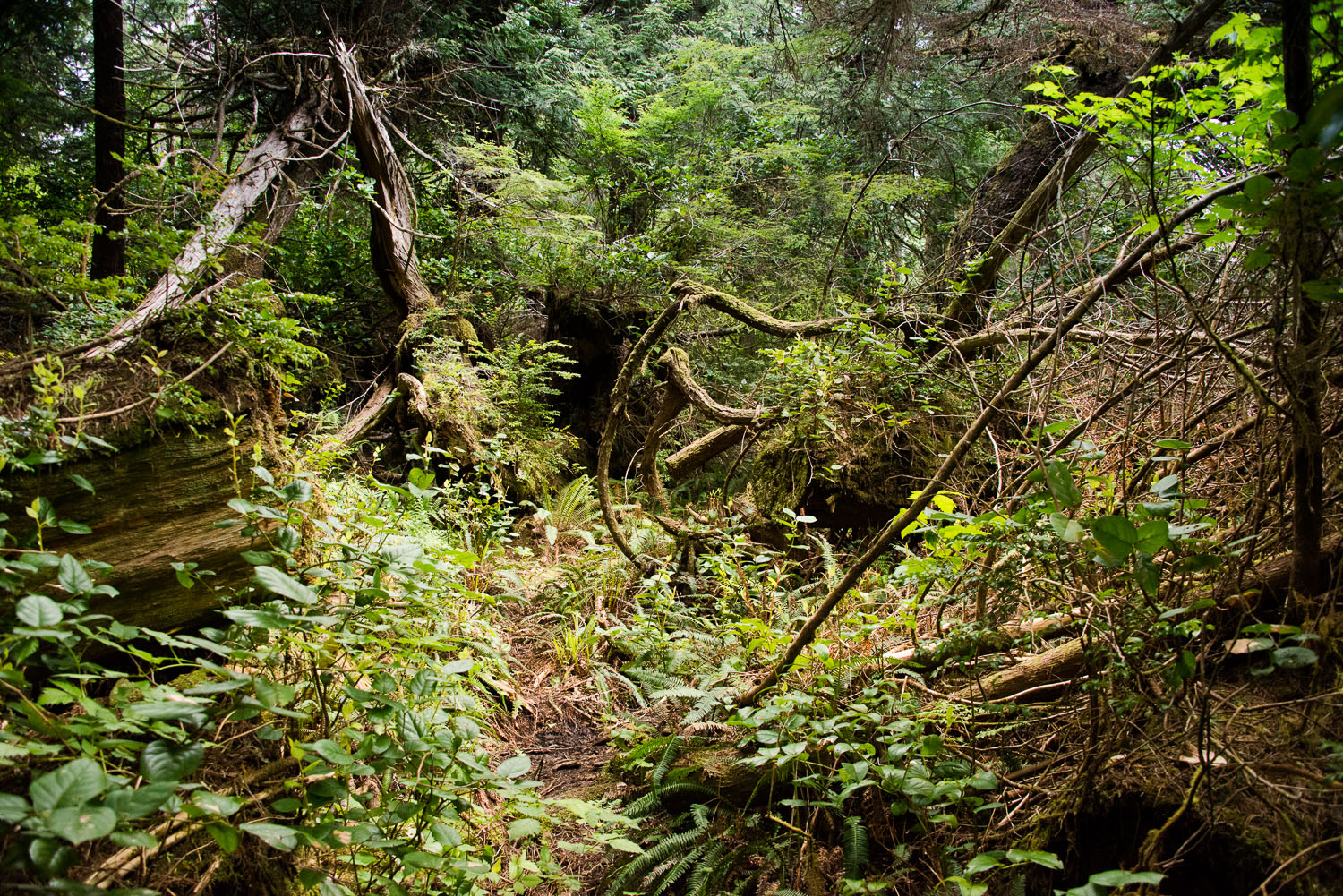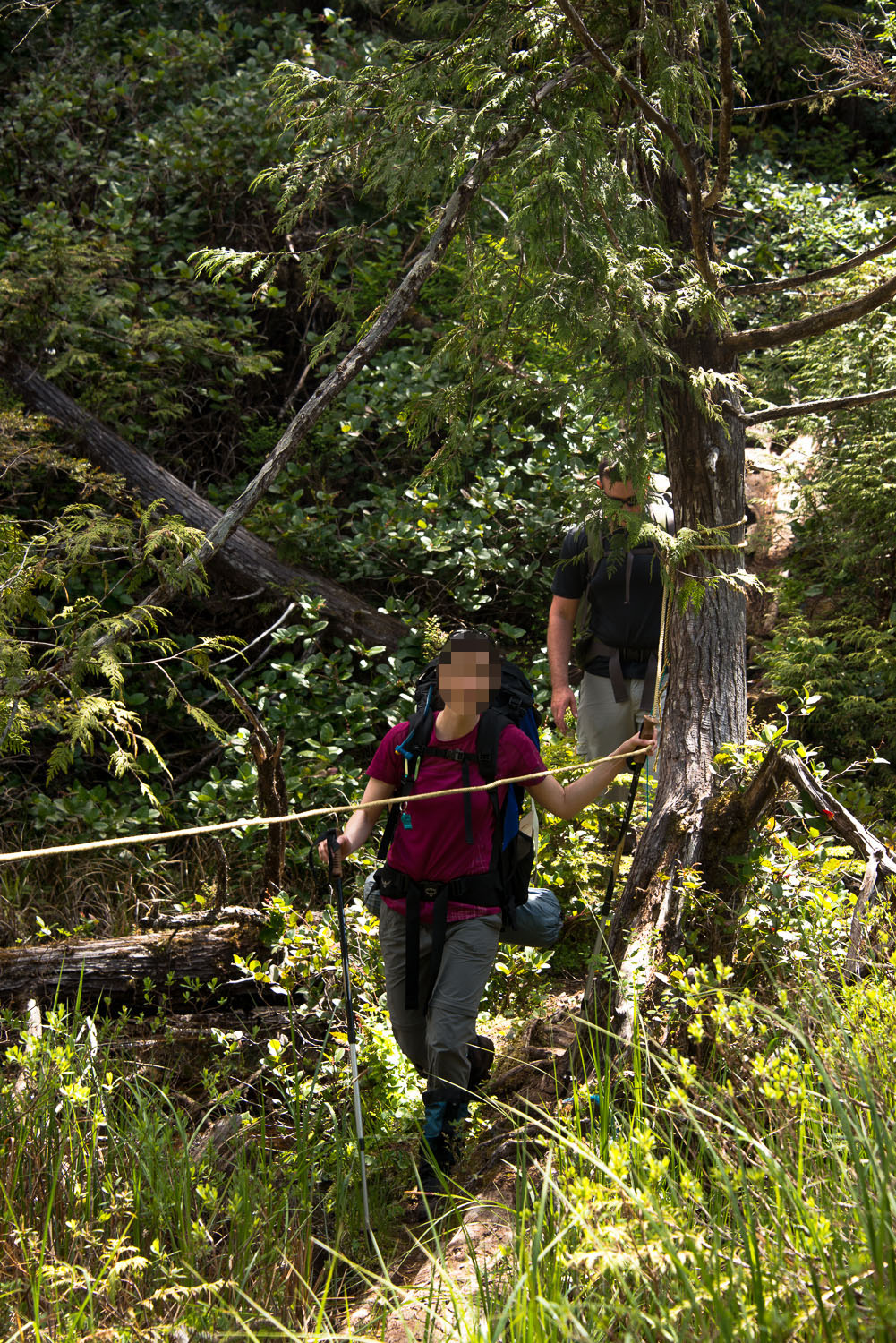 Since our hike was going to be short we didn’t hit the trail until late morning. The weather in Bamfield must have been dry for a week or more because the trail in was surprisingly good, considering that I usually refer to it as the worst trail on Vancouver Island. We made it to the Tapaltos Bay/Keeha Bay junction in just 45 minutes, about 1.5 km from the trailhead By the time we got there we were all quite warm even though we were hiking in shorts and t-shirts. Looking at the map to Tapaltos, it looked like about the same distance but we were apprehensive as this section of the trail is often called the disappearing trail. I was worried that the trail would peter out making it hard to follow. As it turns out, the name is deceiving. It is not because the trail is hard to find, it isn’t. It is referred to as the disappearing trail because at times you are asking yourself, “is this really a trail?”. There is a lot of mud and obstacles on the trail. Several points you need to climb over large logs, cross streams on logs, duck under trees and roots and even cantilever out over mud pits.