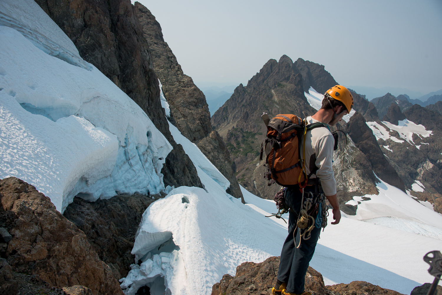 With all the climbers safely below the chockstone, after the first rappel, Ryan set up the gear off the best possible object. We found a small rock that is firmly affixed to the shelf, It had a half dozen sets of webbing attached to it.  After setting up the rappel he descended … and ran into some trouble. The descent is completed by stepping off rappel onto the glacier.  Herein lies the challenge, the glacial moat.  Ryan, who is 6′ 4″ had a real struggle trying swing out and catch the edge of the glacier with his ice axe and somehow manage to get his crampons dug into the edge and get off the rappel. Consequently, we searched for a new descent.