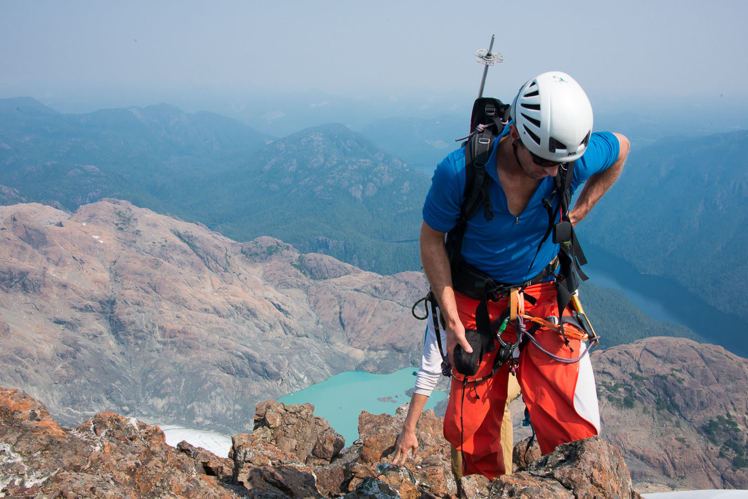 On the summit, we took a chance to read the register and remember past visitors. We found some familiar Vancouver Island names: Lindsay Elms, Tak Ogasawara and the late Charles Turner to mention a few.  We planned our descent. Rather than hike down the way we came, we committed to descending the East Ridge via the chockstone, sometimes referred to as The Window.  Descending below the chockstone requires a double rappel. The first is over uneasy terrain but worth putting up the pro.  The second offered adventure!