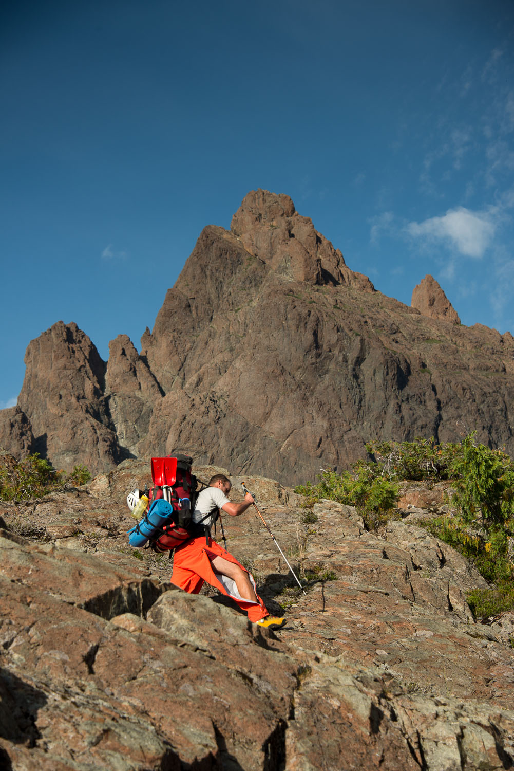 By the time we reached the balcony, a viewpoint that gives an amazing view of the range ahead, it was 7:00 PM. We could see our destination at the top of a steep scree slope that leads up to Nathan’s Col. Additionally we could see and hear, I imagine even taste, water far down below us at the base of the scree. We hiked forward, losing some elevation and eventually hit the water source. As we drank our fill of water and filled our bottles we watched as the long shadow of the ridge above cast its ominous shadow across the landscape. Foreshadowing a nighttime ascent of the final slope…