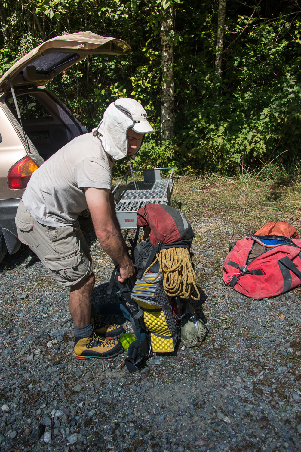 While driving down the Zebellos Mainline we could see Zebellos Peak on our left, obscuring our view of the Haihte Range. Shortly after making the turn onto Nomash Main, we crossed the bridge over the Nomash River and we were greeted with our first view of our destination. First, the South Blades then Rugged and eventually Merlon and eventually the whole range. We stopped to admire the range but quickly ventured down the good quality logging road to our destination. Ultimately we stopped at the old N20 Spur and piled out of the vehicle.