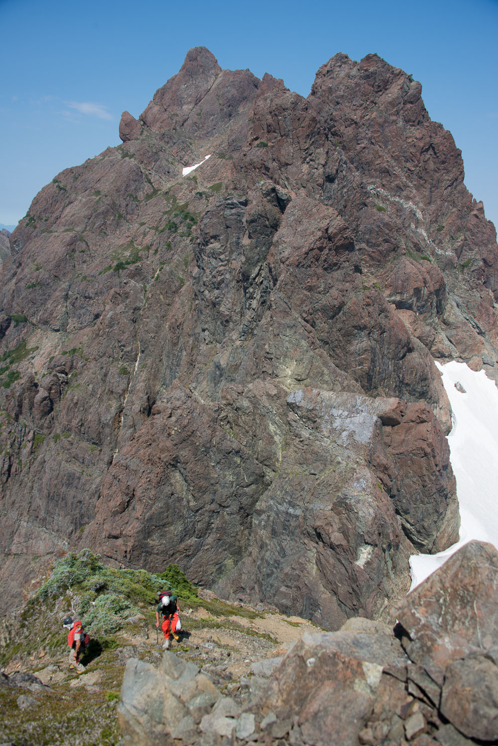 Our first peak was the closest to the Gendarmes above our Nathan’s Col. Although it was easy to ascend, once we were at the summit we had a clear view of the ridge that leads to the east face of the Gendarm. It looked as though it would be possible to reach our camp, if we traveled along the rocky ridge between the two peaks and up over the notch on the Gendarm. We didn’t test this theory as we were still in search of our summit at 1670m!