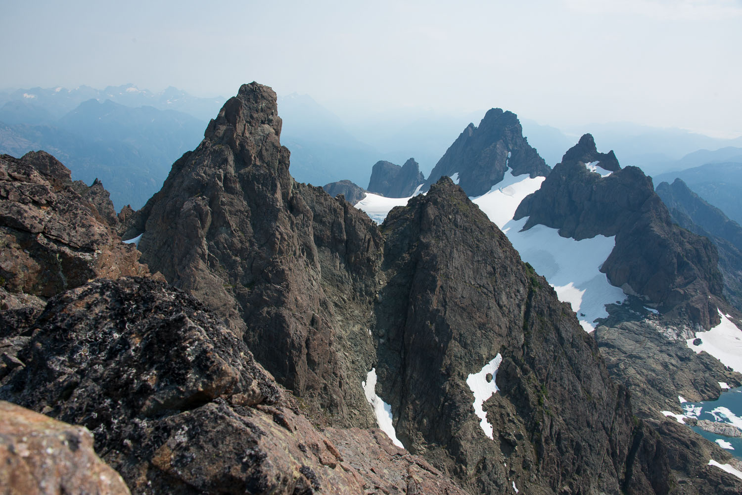 From the high vantage point at the col,  we couldn’t decipher if the area beyond our view bluffed out or not. Therefore we descended around 1400 metres before starting our ascent to Triplets ridge. Triplets forms several peaks on emerging from an easily traversable ridge. The ridge forms a line, that line is both physical and political, it lines the edge of Woss Lake Park. We ascended to a col between the south peak of Rugged Mountain and what looked to be a high point on the ridge. Our impetus was several small bottles of whisky, purported to be at the summit of the South Blades!