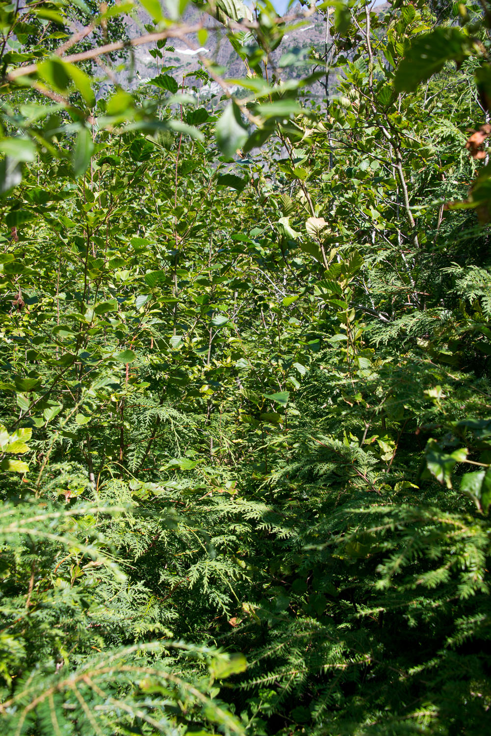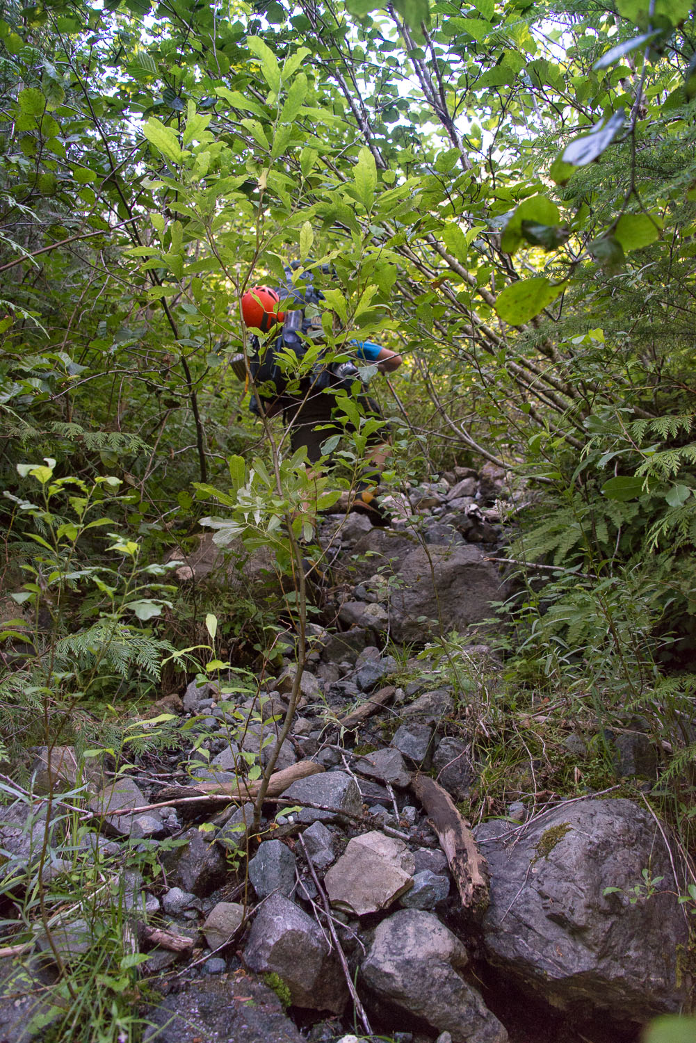 At the 650 m/ 4km mark, the clipped portion ended,– dramatically! A wall of alder with some hemlock interspersed inhibited our progress greatly. Although there was a flagged route through the mess of new growth, we eventually discovered that it wasn’t the fastest or easiest route. The flagged route draws the hiker closer to the eastern (left side) and progress becomes more difficult as you need to climb over fallen trees, combat alder and traverse gravel wash out. We discovered that trying to find the old N20 spur was worth the effort. Although the alder was grown up, in many sections you could easily plow through, saving a lot of time. This section of the trail only lasts for about 600 m but it took as nearly 45 minutes to get through, partially because we were looking for the route up that would allow us to gain the ridge above us.