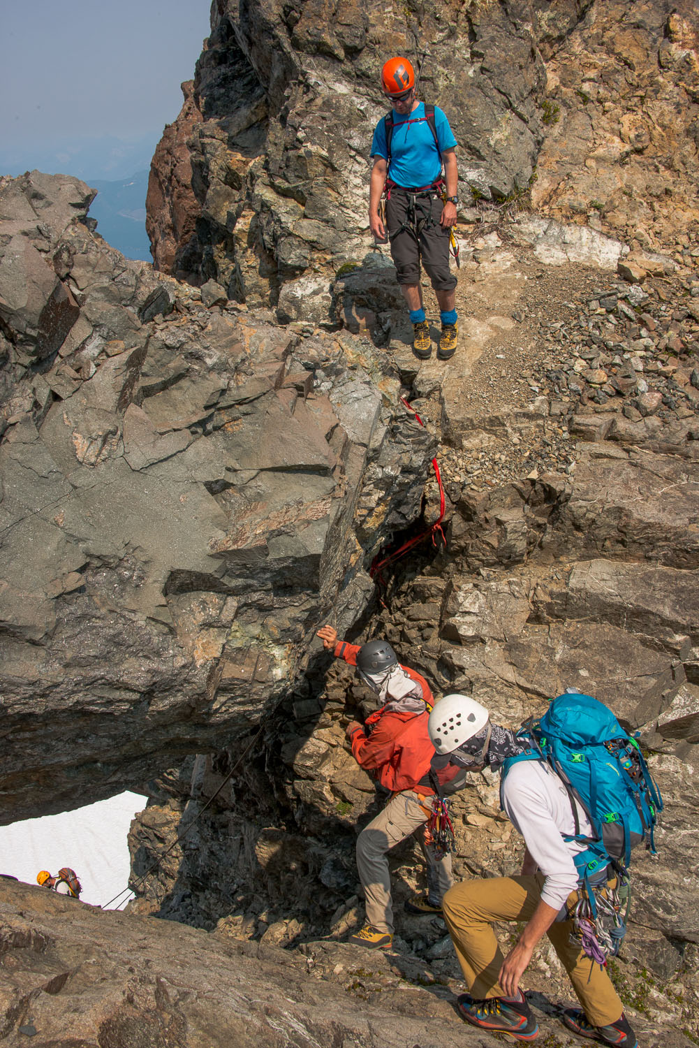 The final ascent of the summit proper is interesting. There were two summits close to each other and the easiest approach to the main summit requires ascending very near the top of the Central Merlon Summit and climb through a notch. From here we needed to slightly downclimb. There was a reasonable amount of exposure to a gully down the east face of the Merlon blades. Mike C. set a hand line to help secure an easier descent. The stone is not solid. There are many small, medium and even a few larger rocks that are poised be pulled off the otherwise easy downclimb. Once down we only need to skirt around a point before traversing and ultimately scrambling up a gully of the main summit to 1817 m, according to my GPS.