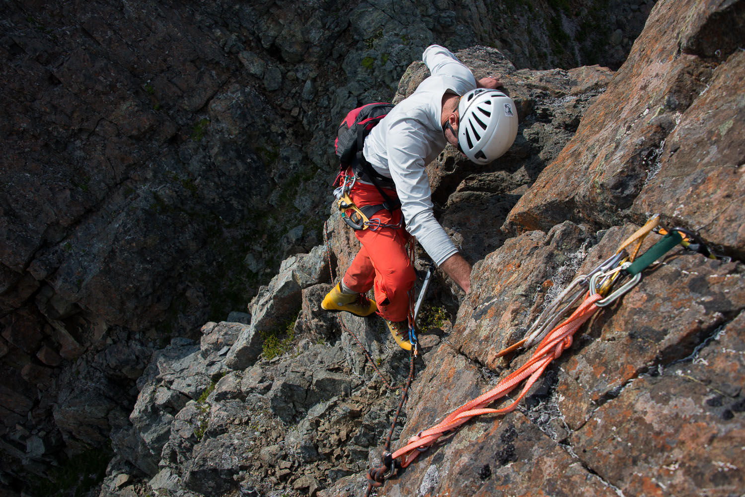 The route continues in an easy fashion across the southwest face of  Rugged, eventually requiring an easy scramble either up a shallow gully or slab face. Either are relatively easy, though each has exposure. This slab leads the climber to the top of the east ridge at 1850 m. The ridge is narrow and is shaped like the peak of a roof! We arrived here quickly, right before noon.