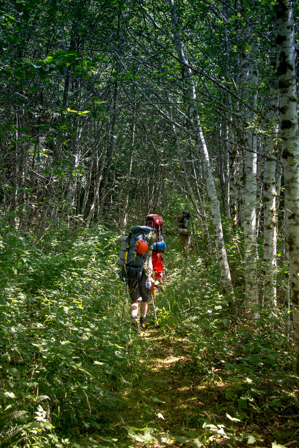 The rain of the morning remained heavy on the leaves of the blueberry, huckleberry…  and every stick and twig in the forest. The day was warm but not hot. Our pace was quick, therefore we didn’t wear waterproof breathable. Before long we were drenched.