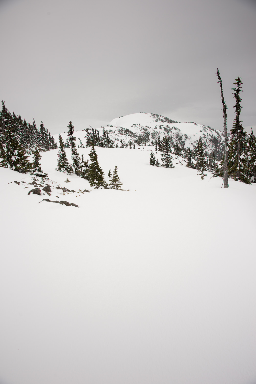The midday snow was softening and it made stepping down the slopes quick and easy. We scooted across the treed col and picked way along the treed ridge that leads to Lupin Mountin. The area is easy to traverse, providing that you have direction sense and have a topographical map. At 1 o’clock we spotted a cairn and stopped to eat lunch.
