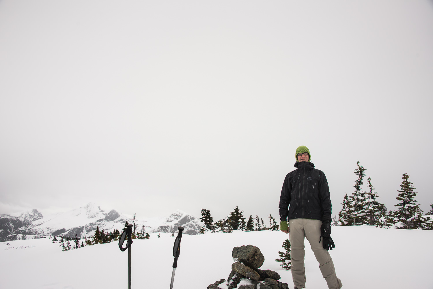 We summited Beadnell (1740 m)  before 1 PM, 3.5km from the car.  I posted a few shots to Instagram and we took a few minutes to assess our next move. Our original goal was to continue along the ridge to Mount Adrian. The weather had other ideas, there was gusting wind and falling snow. We had concerns about exposure to the elements. We made a difficult decision to save that peak for another day and descended along our route to hit the long ridge leading to Lupin Mountain.