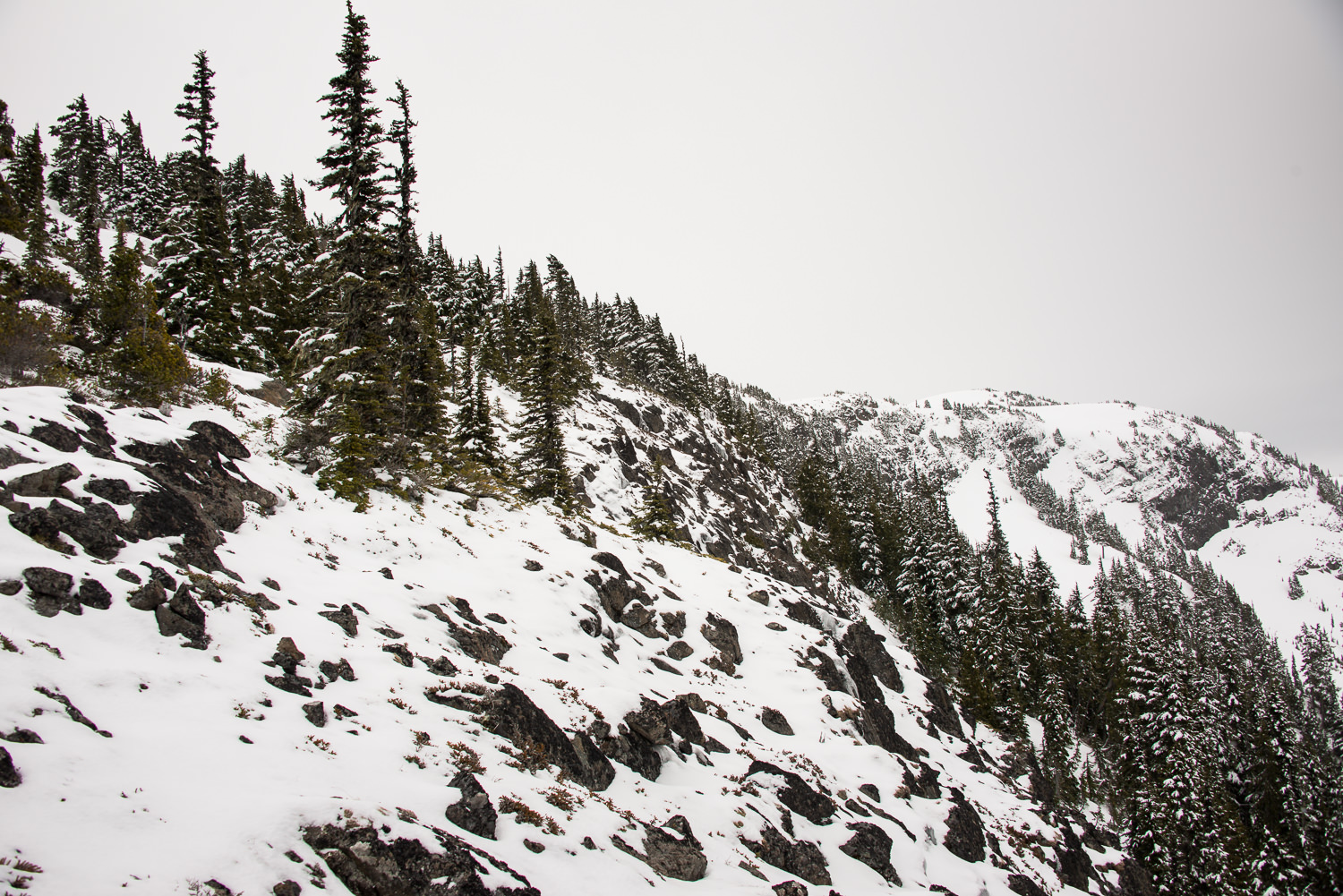 I took the lead heading back to the car. We contoured around the higher portions of the ridge taking a more direct route through the trees, heading back to the car.  We had little difficulty making through the forrest, the trees were small the ground was clear and there was relatively little dead-fall.  I don’t  recommend taking my track, we were simply trending downhill guided by the terrain, there is definitely not a trail. Further, once below at the car, we could see that we were lucky! Looking back to Lupin Mountain we could see many places we may have found ourselves bluffed-out. The easier way to ascend, probably taking equal time and less energy, climb to the small lakes at the col between Rogers Ridge and Lupin Mountain.