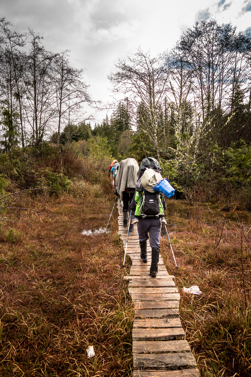 In preparation for the hike I asked everyone to meet at the First Street Doc in Tofino. Everyone was on time and after a few quick formalities we were made our way to the dock where we met our skipper for the 40 minute boat ride to Ahousaht. Somewhere en route to the island, the forecasted rain started to fall. By the time we were debarking the boat there was a full-on drizzle coming down on us.