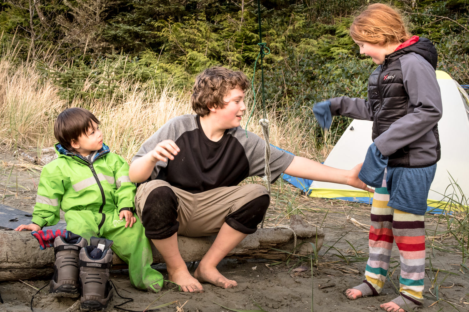 Upon arriving back at camp I took over care of Hemingway. Kim visited with the other hikers and campers. The three kids played very well together. To the merit of the older children they were very careful and patient with the wee man. Toward the end the day Hemingway and I played at the waters edge. He took joy in running with the small waves. He would stand on the shore as the waves gently swept in at his feet, when he would squeal and run backwards avoiding it. As the waves ebbed back to the sea he would toddle forward with it, only to squeal again as the cold water of the Pacific ocean swept at his feet. We played at this for a good half hour before heading back to camp for dinner.