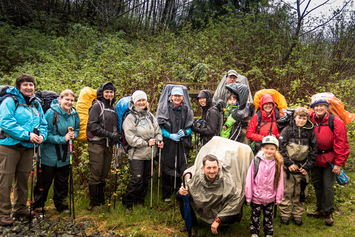 | A happy group of 14 hikers and one freeloader, in the rain |