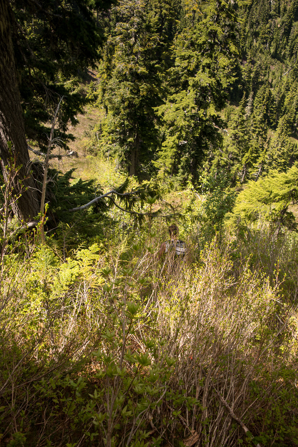 The return hike was quicker, it had a strong downward trend back to camp. The only challenging section on the return was the ascent up to the unnamed ridge. The greenery that provided such wonderful handholds on the way down thwarted our ascent! As is the case in regions that receive several feet of snow each season, the braches all pointed downhill. When travelling up they got in our way and made progress annoying but not impassable.