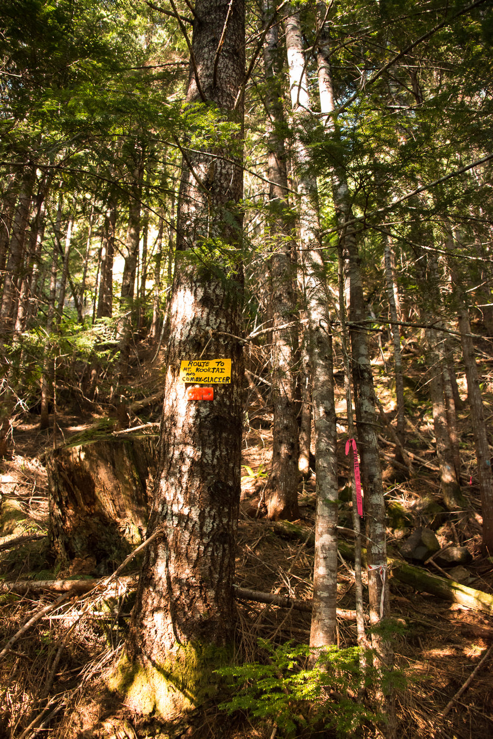 Even upon exiting the car we new the day was going to be hot. though it was very chilly in the shade as we start at 8 am, the distant hills were bathed in light and the dry scent of the mountains drifted to us…. It was going to be a scorcher. We had a route to follow, and we made our way to the start of the trail quickly. A ribbon marked the start of our route, leading us onto a long abandoned and now lightly overgrown old logging logging road. We followed along a lightly booted but ribbon path to the end of the road (600 m), where we found a plastic signed, marking the Kookjai Route to the Comox Glacier.