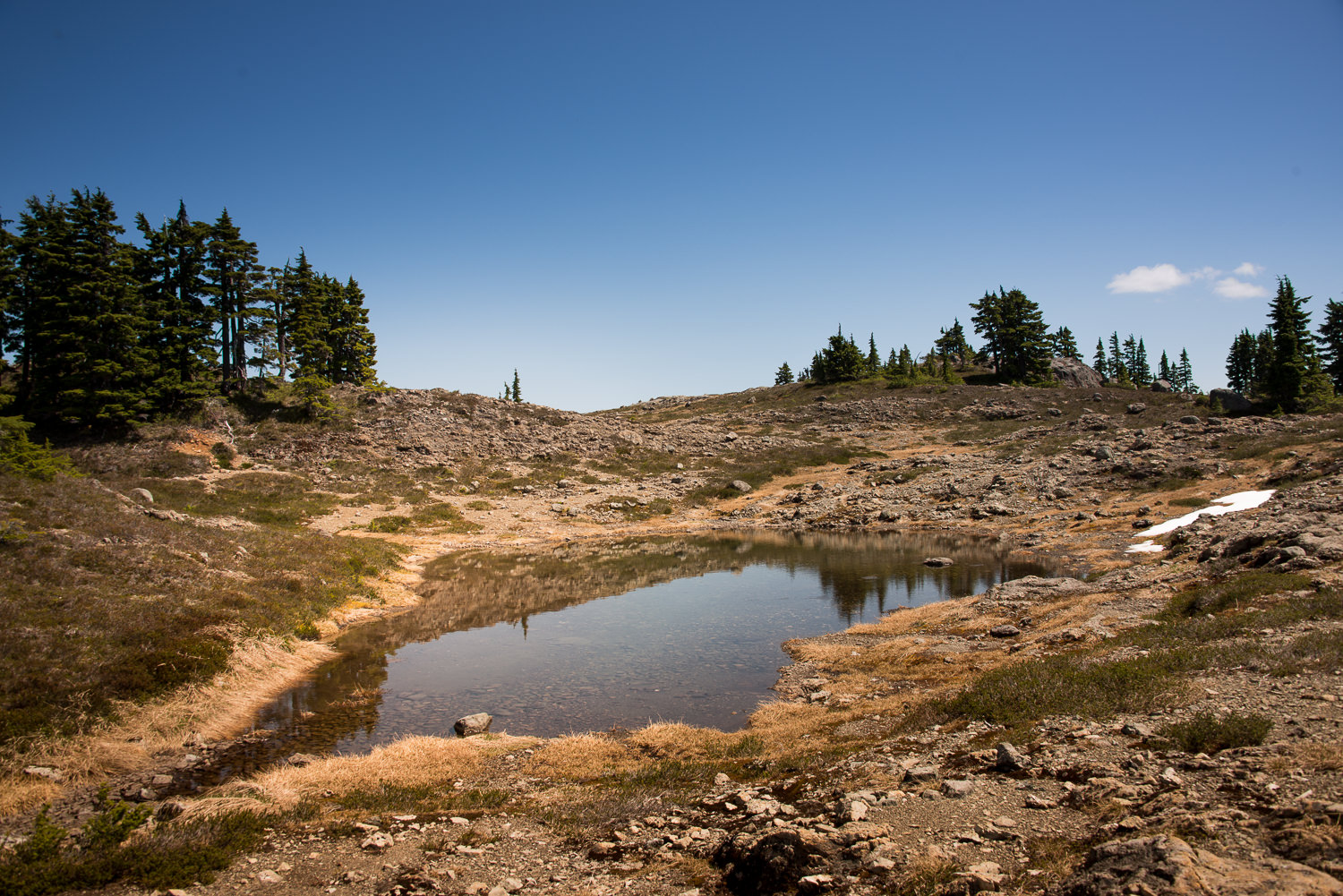 The lakes are about 7.5 km from the trail head at 1080 m, they are a beautiful, they are surrounded by meadow grasses, which can provide suitable campsites in drier months. On this trip the grasses were just awakening from the short winter, they were mostly still brown. We easily picked our way through through the soggy ground to a smaller lake, closer to the next ridge we needed to ascend. We chose to camp in the grass, to be close to the lake but I would recommend a higher level, it would be much drier and likely a better camp spot. We arrived at the lakes around 12:30 pm and set up our tents and took a break. Rick even took a short nap. I think he may have been suffer from minor heat exhaustion. By 1:30 we continued on our way.