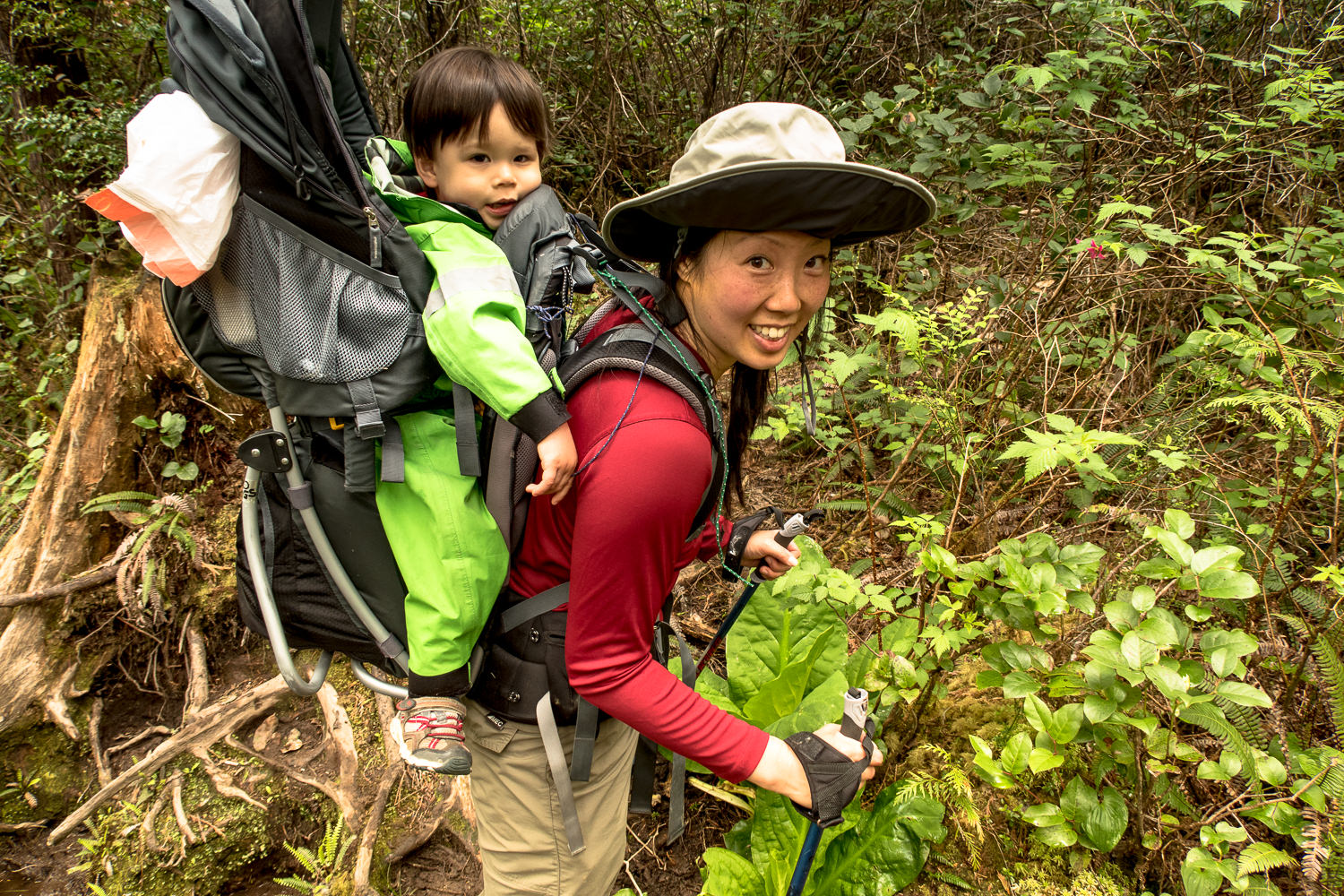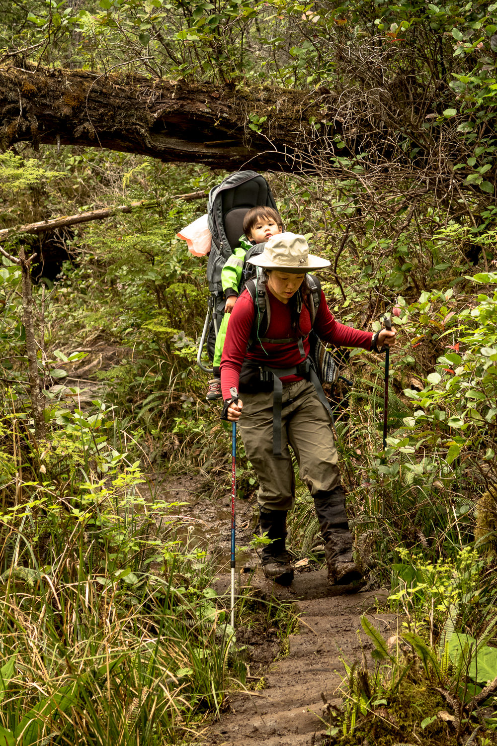 I wrote about the trail conditions, it’s highly technical, requiring root hopping, cantilevering over mud pits, walking on wet fallen trees and an ability to navigate through the plethora of low hanging vegetation waiting to snag or trip you up at any moments notice. She meets these challenges with a positive attitude. I can’t boast about her enough.