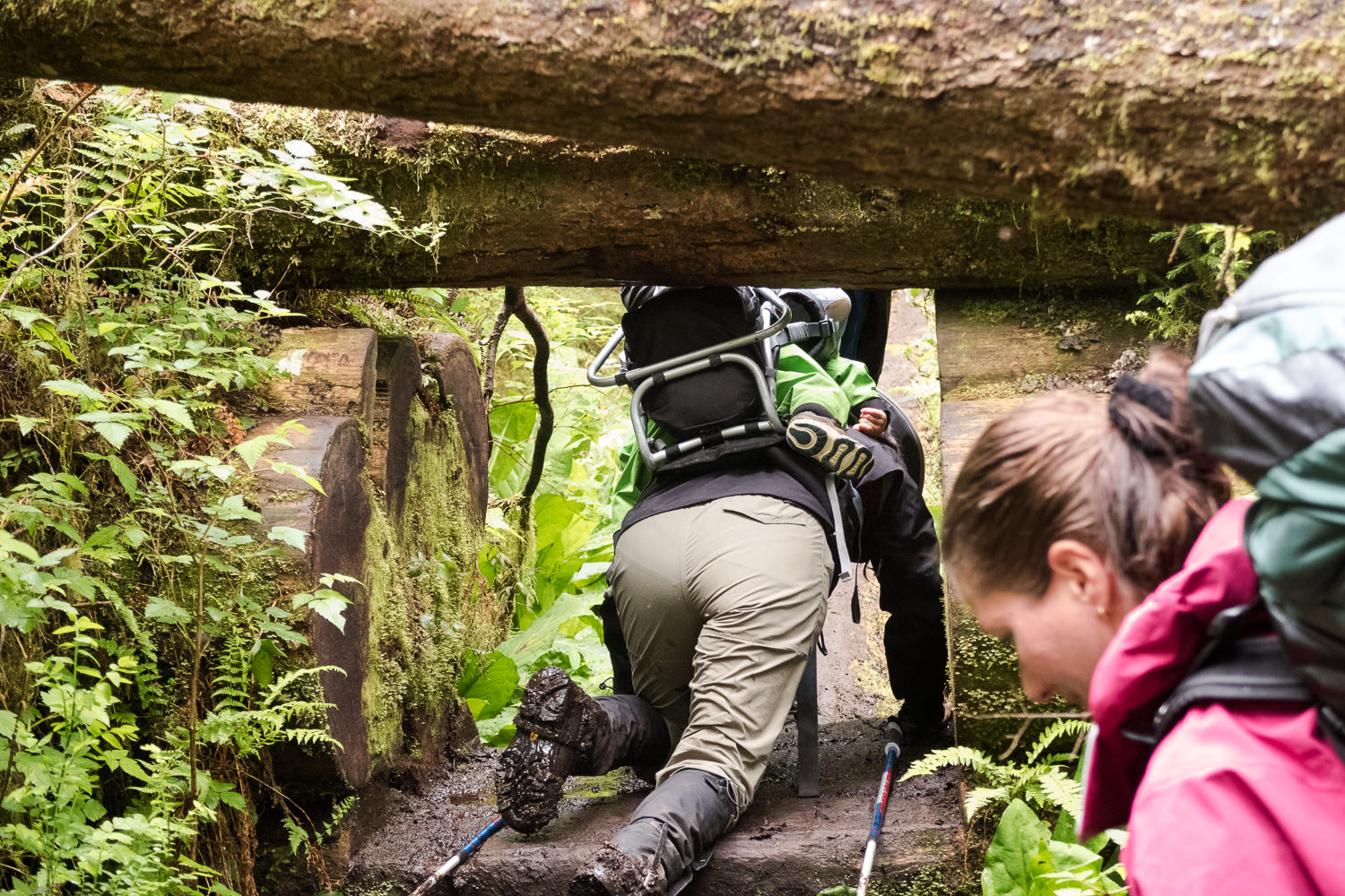A few of my personal favourite features are the large fallen tree that has across the path. Years ago a kind soul cut a hole through the very large log to make passage easy. However, another large tree has landed exactly on top of the first making a keyhole that you have have to travel through, most people will be on hands and knees, unless you have flexibility. If you take a ridiculously large backpack you expect to take it off to pass it through. The immediate next feature is a large mud pit with a large fallen tree suspended over it. You have to walk through the mud and simultaneously get really low to get under the tree. Over the years folks have added pieces of wood and tricycle tires to make it easier to pass through. It’s getting easier but the variable conditions of the trail mean you may be up to you calf in mud, if you step wrong.