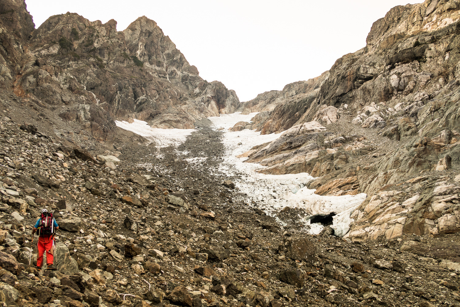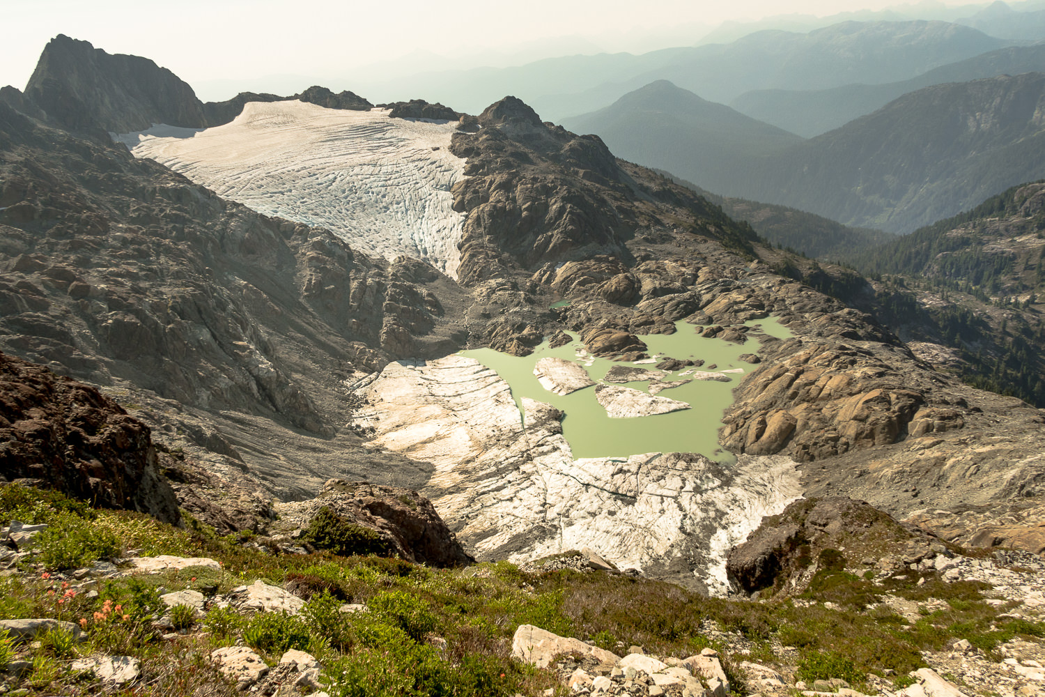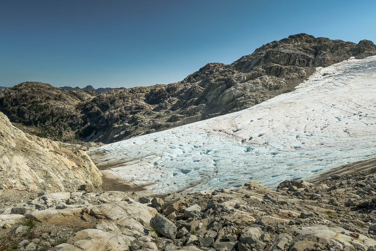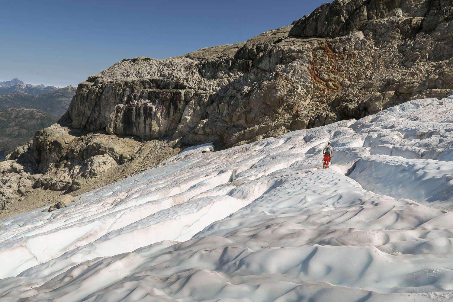 Ryan tailed behind me a stretch, so I set a while and enjoyed the sun and enjoyed the views. When Ryan arrived, we ate our lunch and descended back to the glacier. Knowing the route we followed in was not the standard route, were looked for an alternate route where we wouldn’t descend to the circ far below the glacier. We hiked over lip of the glacier to the north edge and onto the rock shelf. I won’t be too specific here, the route is convoluted but rest assured there was little in the way of exposure and only a few easy class three sections. We eventually rejoined the route we came in on and walked the final few kilometres back to the gully that started the adventure.