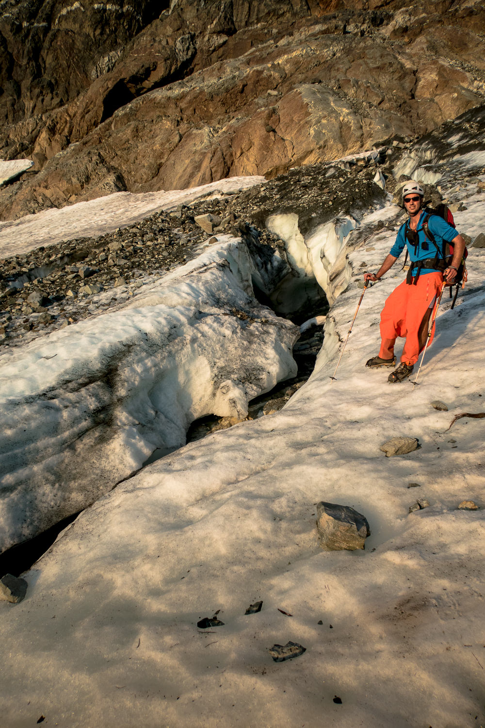 The next morning it was still twilight as we started walking but we had a long day ahead of us. Because our planned routes were class 3 and 4, we didn’t bring ropes and our packs were light. We carried our cameras, first aid,crampons, mountaineering axes and our lunches. As we approached the Septimus Glacier we were in awe of the condition. At first we thought that it was almost gone but upon closer inspection we could see the ice hidden below large deposits of small and large rocks; likely exposed as the glacier rotted away. We were careful as we climbed the glacier, there are many crevasses, moulins and areas that are so rotted that the rock below is exposed. Due to Ryan’s love of glaciers we moved slowly, we made the ridge within 2 hours of our start.