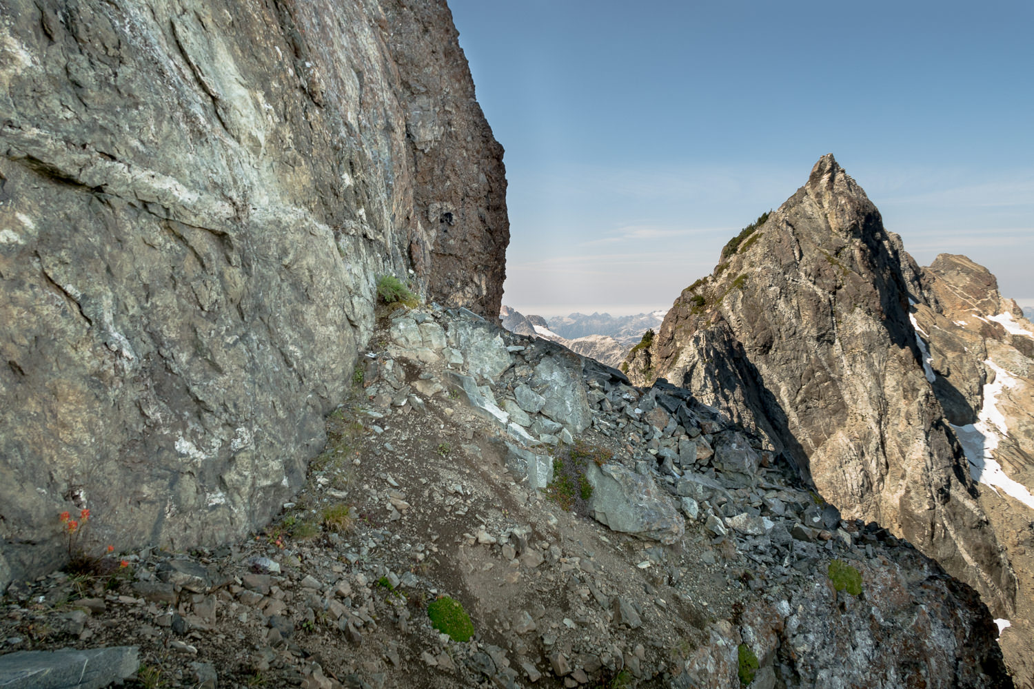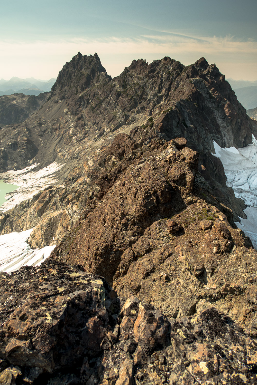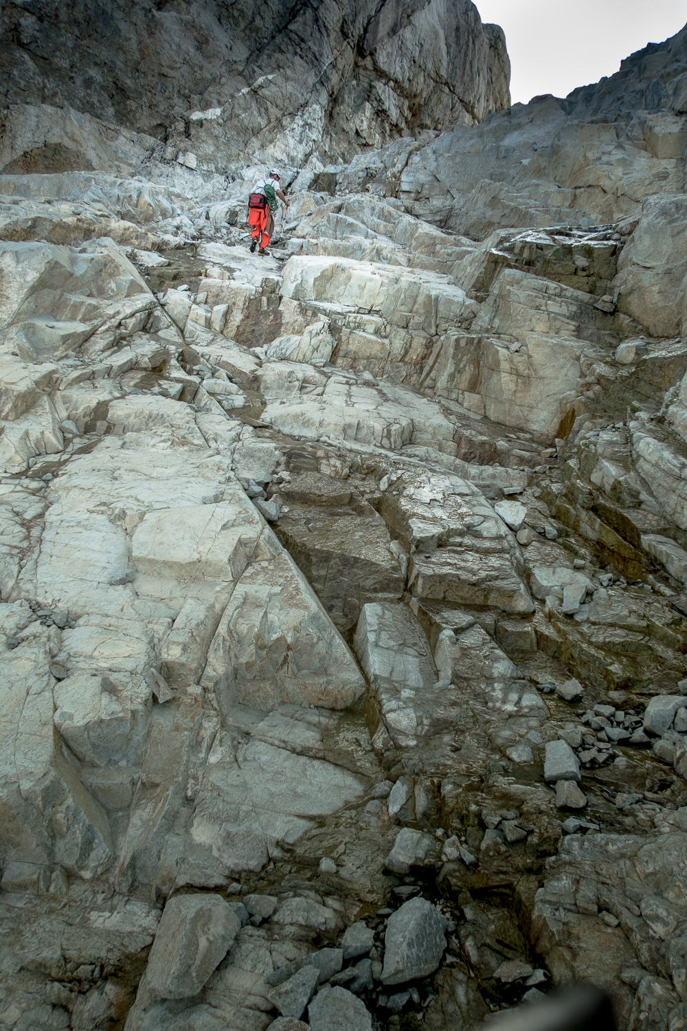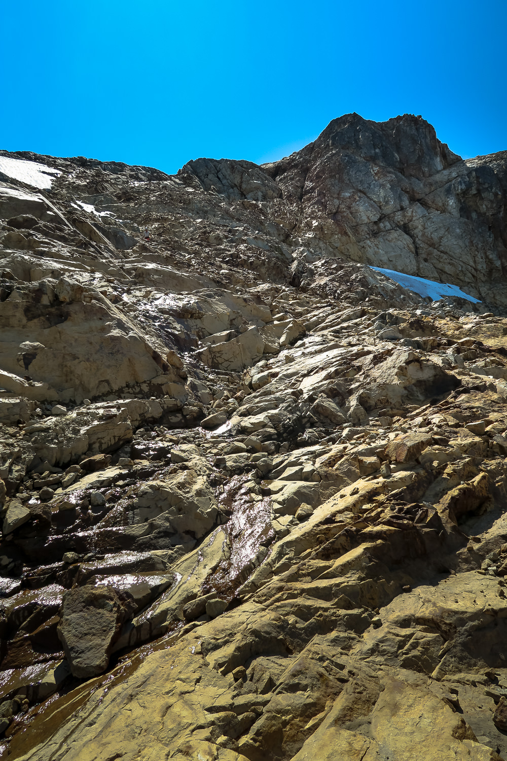 My understanding is that up until a few years ago, an extensive snowfield/glacier wrapped around Big Interiors sub peak and base of the summit. As of last year large sections of it have melted away, exposing steep rock covered in glacial flower. Deposits of the powder-like substance are deposited on the rock slab that we climbed on the way to the summit. The route up is a matter of picking your way, many different options are available, we stayed low and worked our way up the scree. Right at the ridge the route gets a bit steep but we were able to find a class three route to the top.