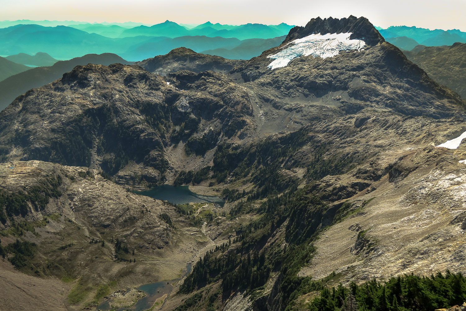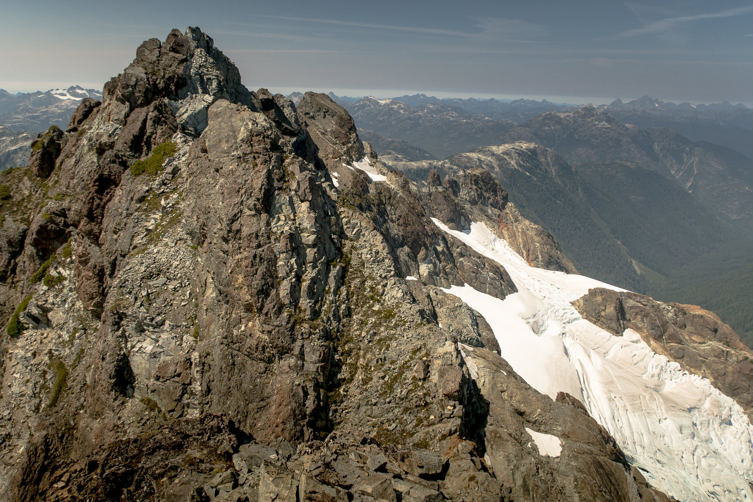 Before descending the southwest face we admired the view. The west ridge gives a spectacular view of Love Lake in the circ below; the long ridge of peaks we were seeking today; and to the southwest, Della Lake nested below 9 Peaks with the majestic Della Falls descending below the Lake. As we descended we traversed the long choss slope below the ridge of mountains on our left. The slope was devoid of snow, thanks to the poor winter and hot dry summer. We walked along the slope to the crest that leads over to Margaret Glacier. It’s here that we stopped to take stock of the day’s options. Our hopes were for Mount Rosseau, The Misthorns and Margaret Peak. We wouldn’t achieve all our goals.