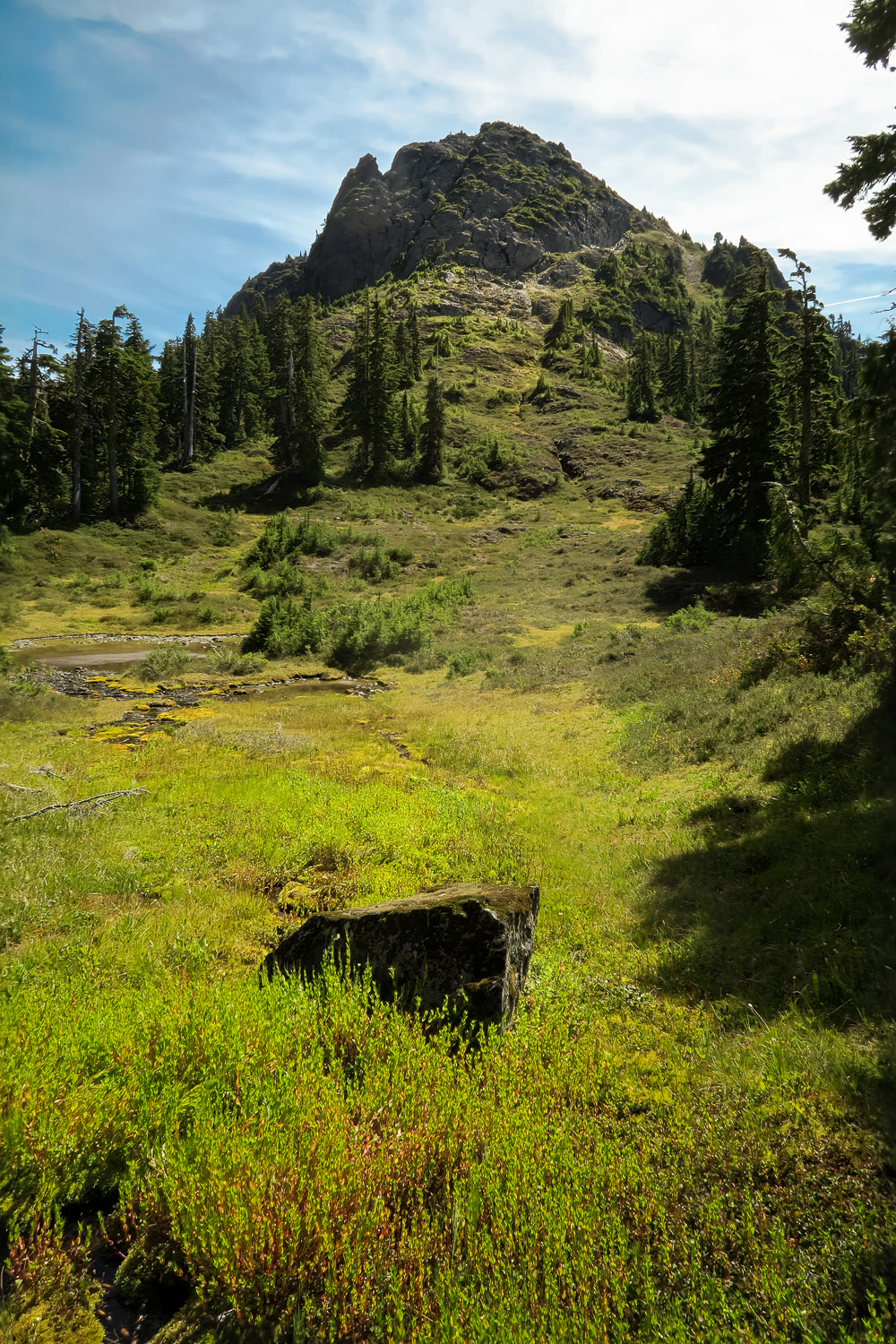 Once up the slope, avoid summiting the ridge top, turn left (north) and follow the crowberry (Empetrum nigrum) and heather to the long (150 m ) drop via an easy hiking slope into the meadow col between Adam Ridge and the connecting ridge that leads to Mount Schoen. Take a moment before descending, inspect the route ahead of you. We hiked left of the centre line, following a greenway. At the bottom of the slope you’ll find a pristine meadow, it’s so idyllic that even a large bear couldn’t resist its charm. We hooted and hollered to push the bear along. It politely obliged and we completed our descent and started up the green-way toward the higher scree slopes that would give access to the top the final connecting ridge.