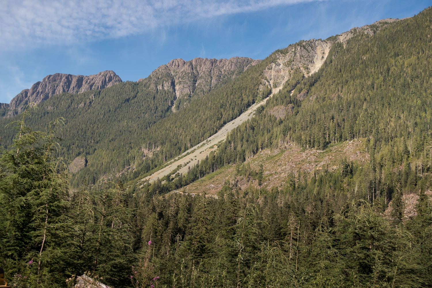 The access roads are quick to drive and easy to navigate, they are all marked. Turn off Highway 19 at the Mt Cain/Schoen Lake turnoff, 10 km before Woss. Then turn right onto the Woss/Gold River road (straight ahead would be to Cain). Follow down the road and turn left (before Klaklakama Lake) onto Schoen Road (obvious) and then just follow that for 19 km (always take the left fork but it’s well signed). As you drive, the big scree slope becomes visible on the left.