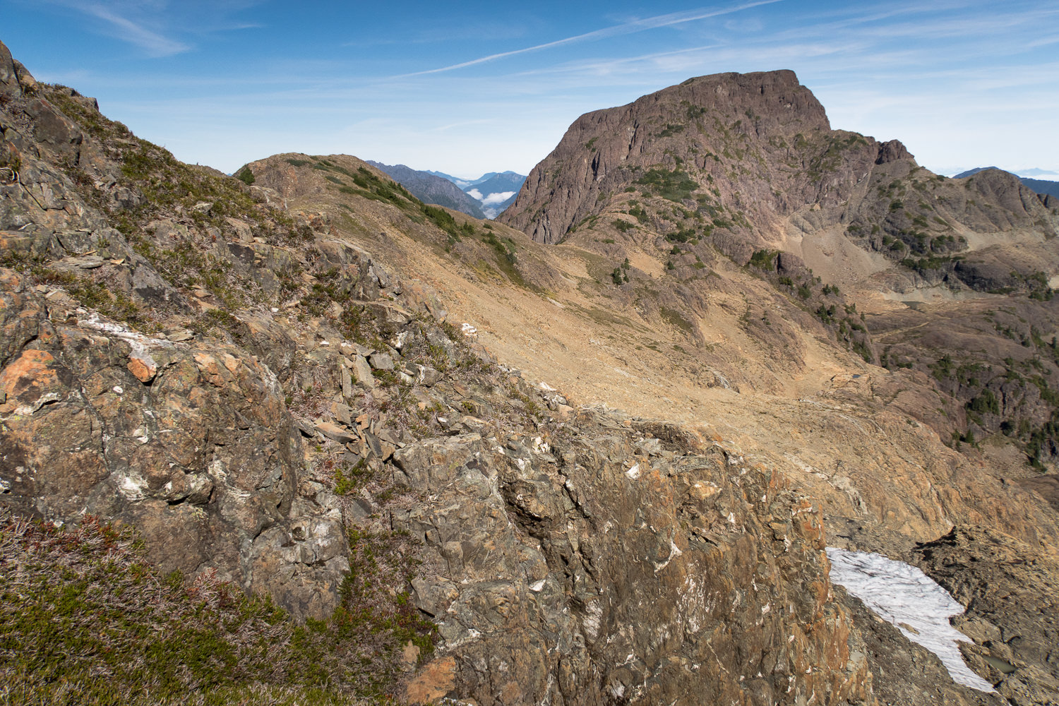 From the connecting ridge the route is straight forward, though it may look daunting it is a nice scramble. There are a series of short bumps before you get to the final summit massif. We tried looking for a route around them and decided it was just as fast to walk the tops of the bumps and enjoy the views. Below the bumps there is a snow field, we left our crampons at home so we opted to avoid this route on the way to the summit, though it may have been more direct the time to put crampons on and off likely would save no time.