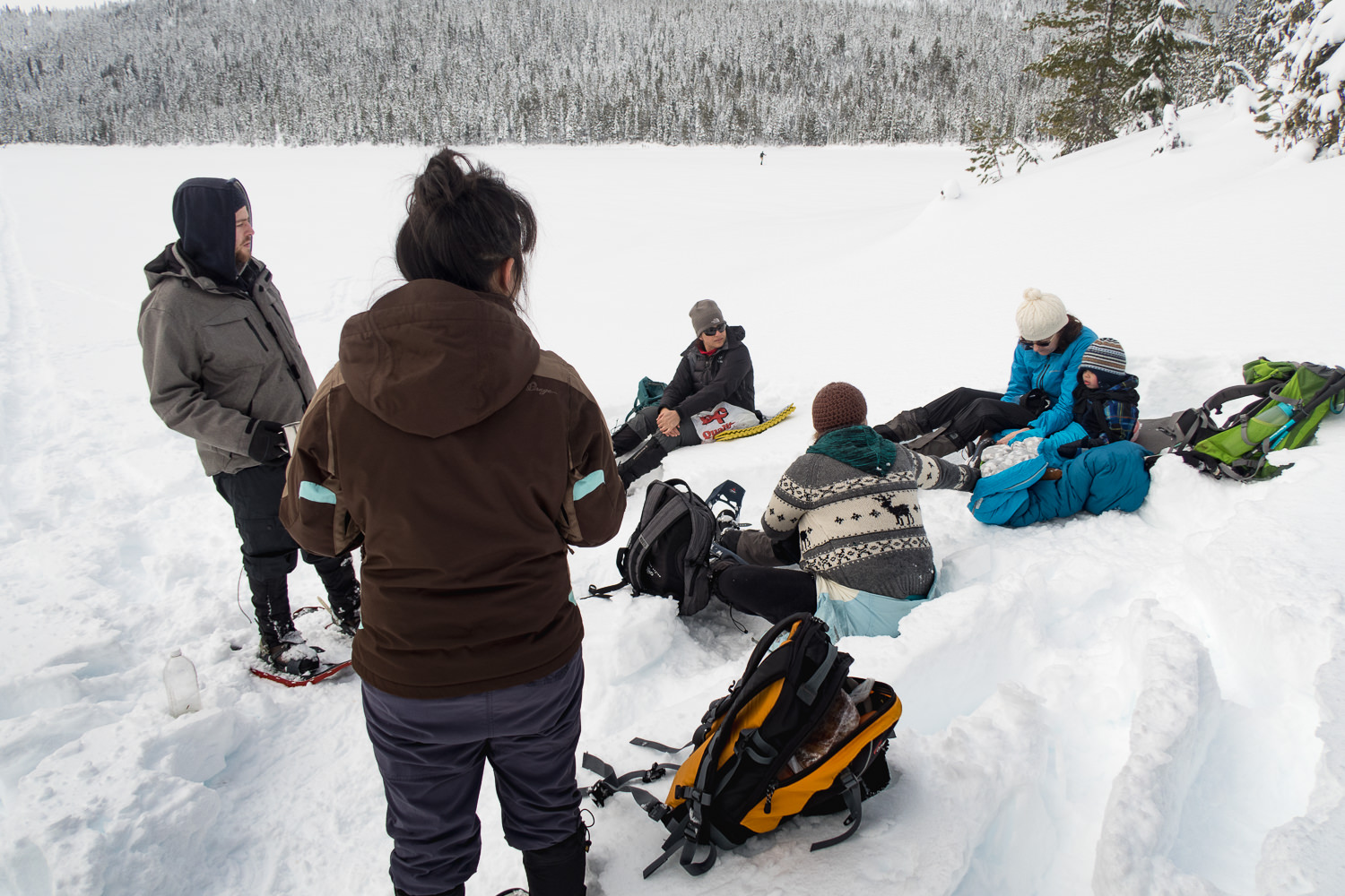On Saturday February 6th, eleven Island Mountain Ramblers headed out from Raven Lodge on an easy snowshoe trip to Lake Helen Mackenzie. Several guests joined us, including two of Kim’s long-time friends, Emhrys and Nichole.