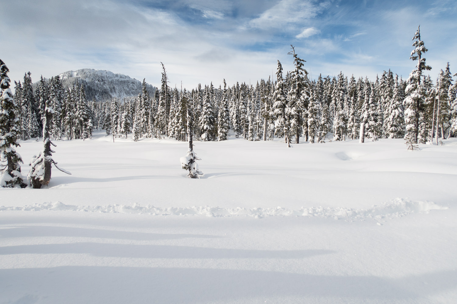 I’m happy that we followed the familiar summer route from Raven Lodge through Paradise Meadows towards the lake. Even though we had used the same route the week before, at least six inches of snow had gathered on the route. This caused issues for the sled, as it’s slightly too wide for a common snowshoe track. It was a serious chore to pull the sled, now modified with aluminum runners, through the too-narrow track.