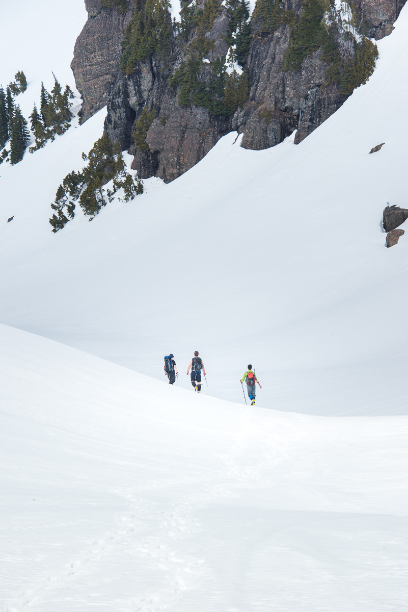 We rose before the sun at 6:00 am. The dark grey sky betrayed the sun coming up behind Alexandra Peak. We struck our camp, packing it safely in protective bags with rocks on top, before descending down the road. We started the descent in snowshoes, save for Rishi; he had gambled by leaving his snowshoes in the car. We followed the road down into the valley between Adrian and Alexandra, up the Buttle 300 spur and into the treeline visible below the bluff that forms the skyline.