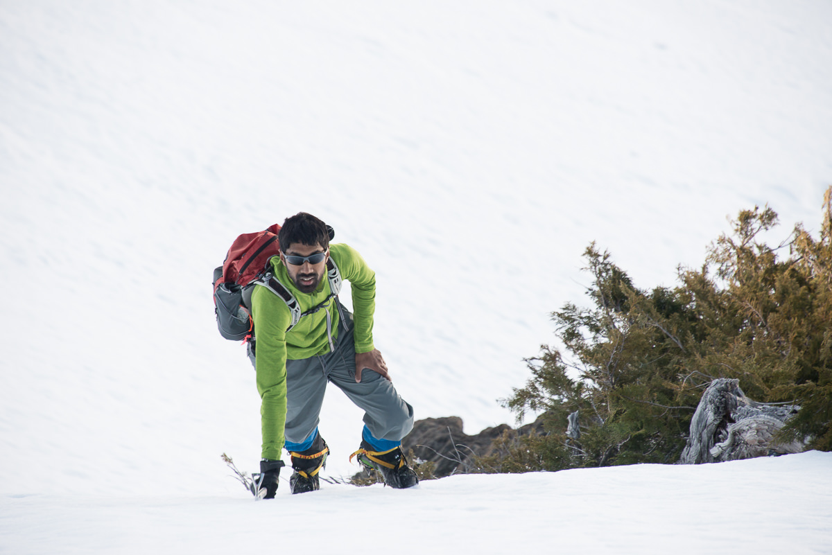 From the trees, the gully gains more than 400 metres. Upon reaching the plateau, we had already gained more than 650 metres. Tired from the evening before, we were struggling, and were less than two hours from camp. Phil and I were soon joined by Rishi and Rick on the plateau, and we discussed our options. There were three possibilities and we chose what looked to be the easiest, walking northeast of the gully to the left of the long summit ridge. Our eyes focused well above the snow in front of us, on a small saddle on the ridge 100 metres above, and the steep snow slope that reached it. We paused at the base of the slope and transitioned to crampons and ice axes.