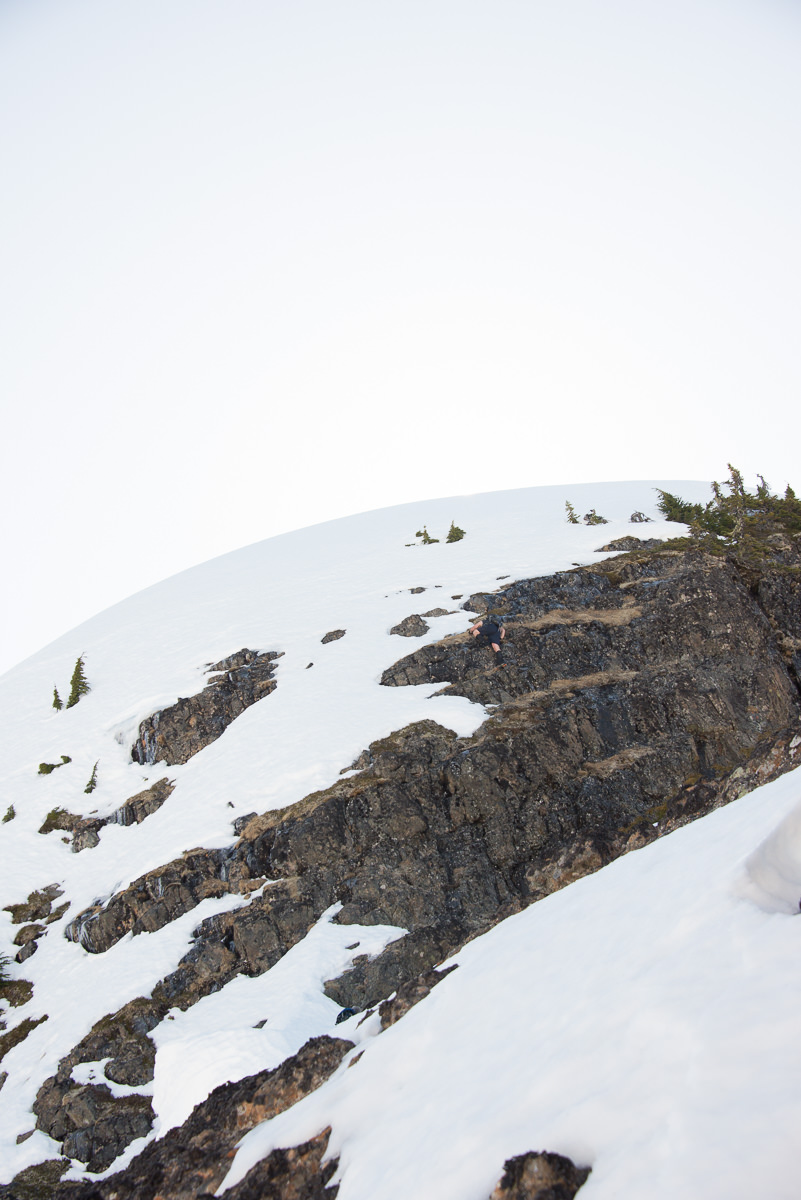 I’m not as brave as Phil. I removed my crampons and stowed them in my backpack before approaching the rock. This final section leads to the ridge above – we were so close! The conditions created more of a challenge: verglas had formed in a few key areas, snow pack covered some hand and footholds, and typical Vancouver Island rock crumbled when grabbed. Further, my aversion to exposure and my stupidity created bigger challenges. I should have put my camera in my backpack; around my neck, it prevented me from getting close to the rock.