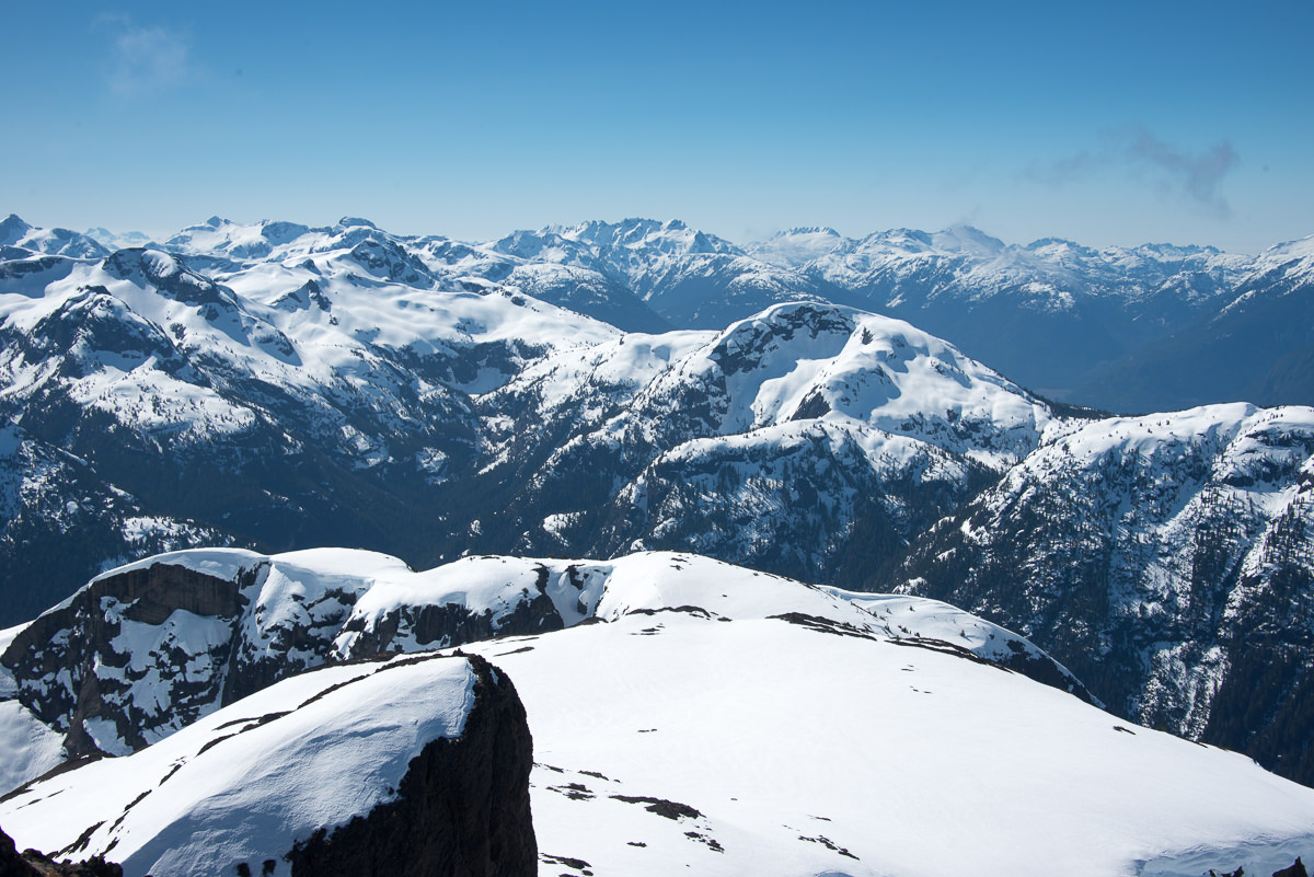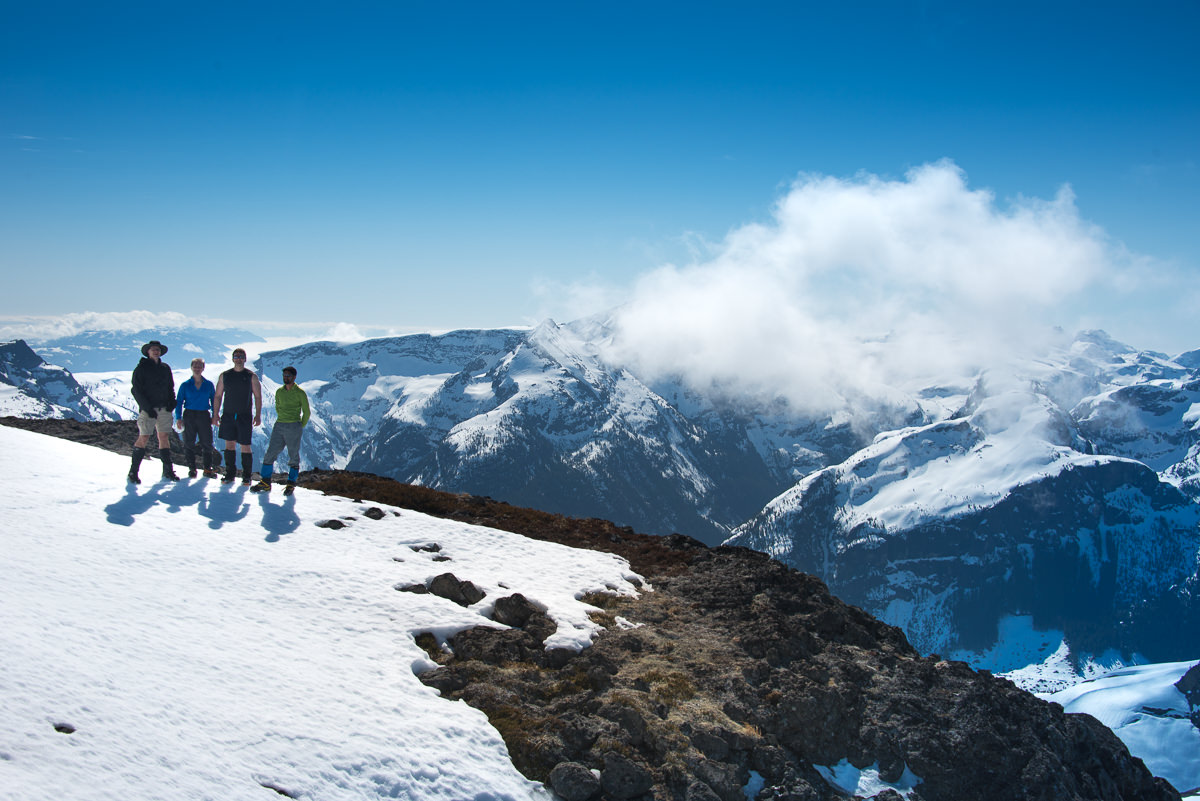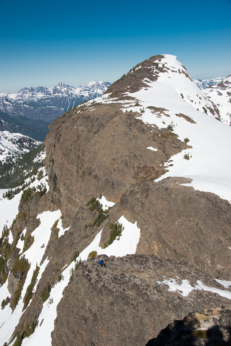 We took our time admiring the 360-degree view of the ridges beyond. To the west, we saw the Cervus-Wolf Dive (a route that Phil and I have scheduled for July). To the east, across the Oyster River Valley, we could see Mount Regan, Mount Jutland, and Mount Albert Edward, including the long snow-covered ridge. I’d never seen them from this angle; the familiar mountains looked so foreign. The conditions were stunning. Rishi said it right, as he was posting his summit shot to Instagram: “Guys, I’m having trouble finding the right emoticon to express how this feels right now.”