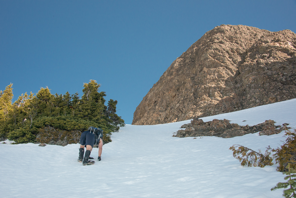 We had a GPS route to work with, which travelled through the saddle to the backside of the ridge above, and then southeast to the inviting ridge on top of the sheer cliff of the mountain summit. We started strong, but before long we were grovelling with hands, knees, and feet on the steep slope. At the upper reaches of the slope, I plunged my axe deeply in front of myself and forcefully kicked through the dense ice crust to the softer snow beneath, creating positive steps that traversed the steep slope to meet up with the final 10 metres of bare ground that led to the saddle above. Even with the great conditions, including an obstacle-free run-out, I was grateful to put my feet on the moss and light gravel of the gentle slope.