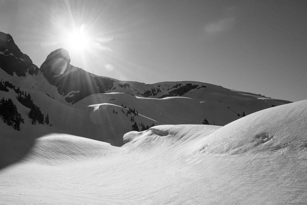 Phil was the first to pop over the lip at the top of the gully. As I heard him utter a string of expletives, I worried about what I would find when I joined him. When I popped over the lip (~1650m), I understood. The cirque below the long summit ridge is a broad, rolling plateau. Today it was blanketed in heavy snow, which practically billowed over the landscape. Adding to the geography, the sun glinted off the snow, the main summit ridge, and the distant hills, creating an amazing view. The chill of climbing the shadowed gully disappeared with a few moments in the sun. Only a small shadow, created by the ridge, remained; we would be chasing the shadow up the steep snow slopes to the ridge as the sun came around the mountain.