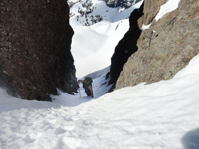 After conferring, we chose to descend via the standard route, rather than downclimb the exposed section of rock we’d come up. From the summit, we only needed to walk a few meters before the rapid descent down the gully to the col between the thumb and the main summit ridge. My understanding is that many folks go around the thumb, but we took the direct route, down the steep snow-filled gully below.
