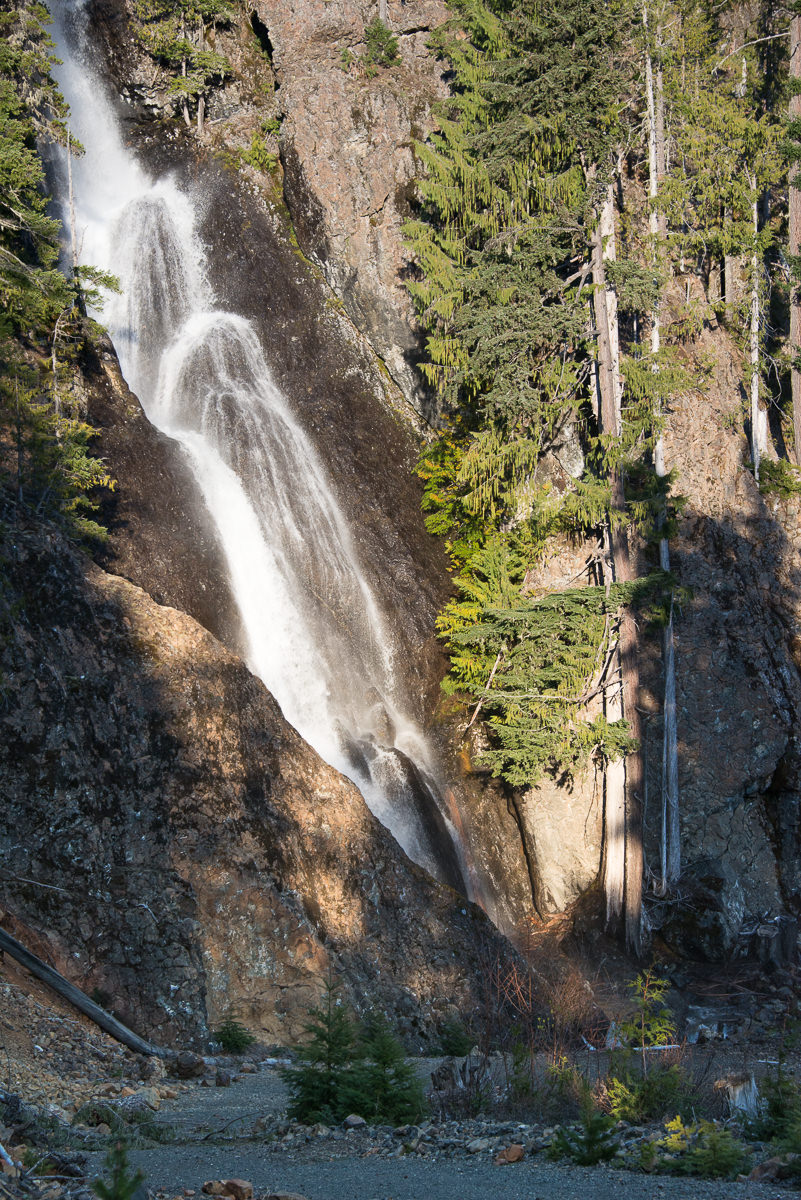 The Buttle Bluffs Mainline, eight kilometres of logging road off Highway 28 that gains ~1000 metres as it switchbacks its way up the mountainside, is the most common way to access Mount Adrian and Mount Alexandra. The road is gated, but those who drive 4x4s can bypass the gate on the right. The road is infamous for its narrow track: while driving it, you squeeze your vehicle between the edge of the road and extreme drop-offs. (