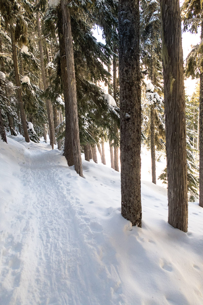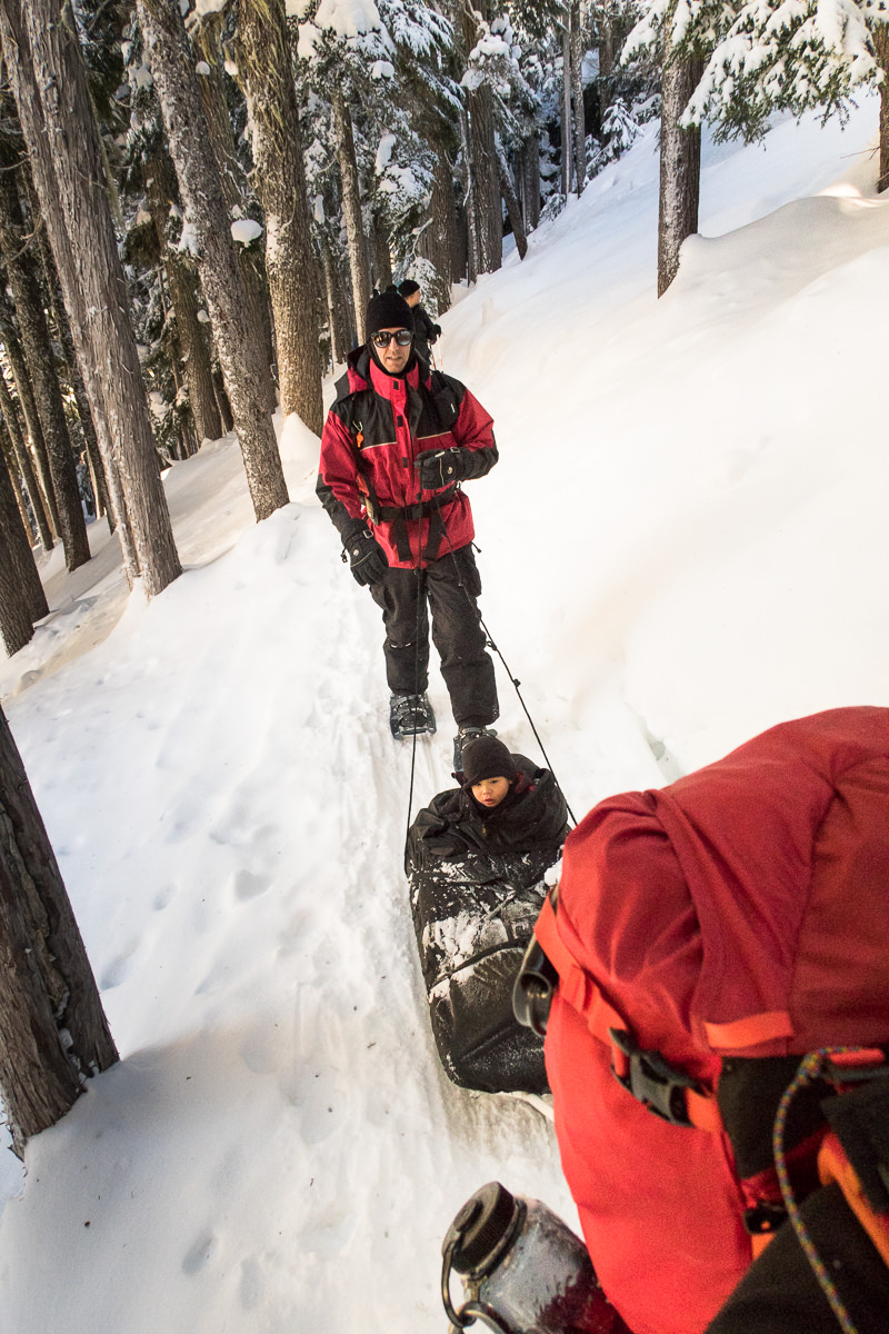 It was already 11 am when we took our first steps on the well-broken route. Our goal was to travel the summer route to Helen Mackenzie. The snow was in near perfect conditions for the sled, it glided nearly effortlessly over the flats. As we descended into Paradise Meadows the trees cut the wind and we were finally able to enjoy the blue bird sky. Walking along the route Hemingway frequently quipped, “be careful!” As we walked the route the sun pierced the trees and put everyone in great spirits.