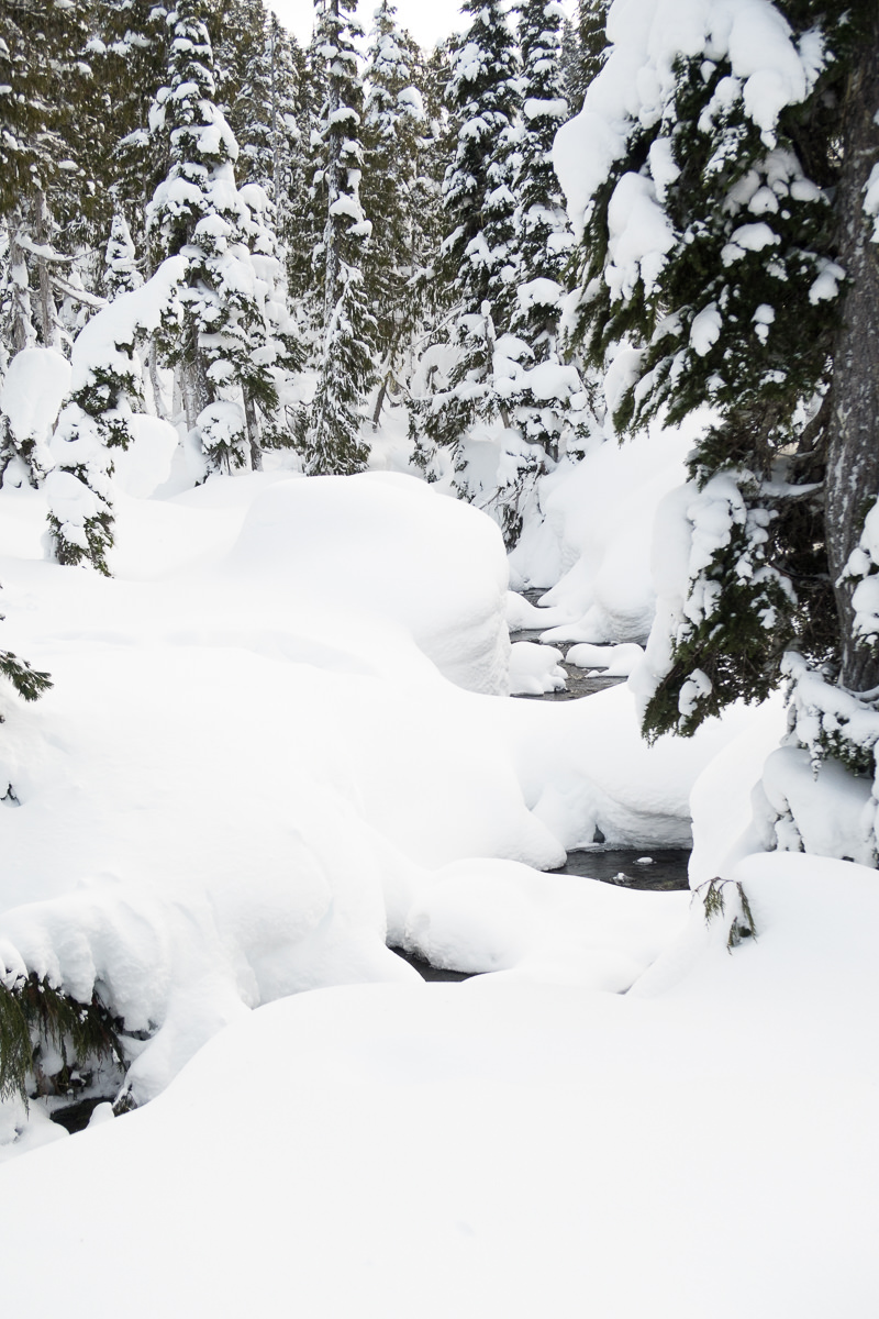 Because the snowshoeing conditions were so fine we found a beaten track leading off toward Battleship Lake. We followed it and made our way back along this second lake. The route meandered across the lake and through the meadows before ending in a maze of tracks that would eventually lead us to the lodge.