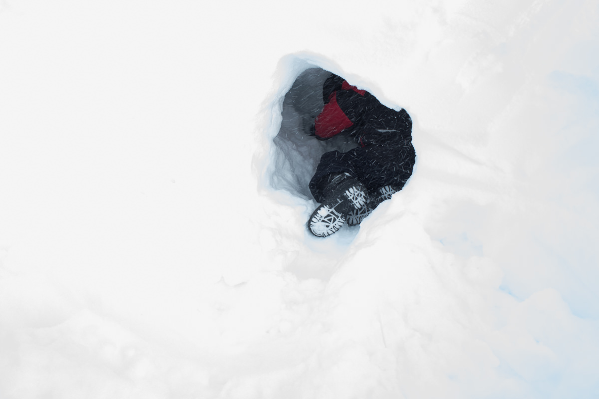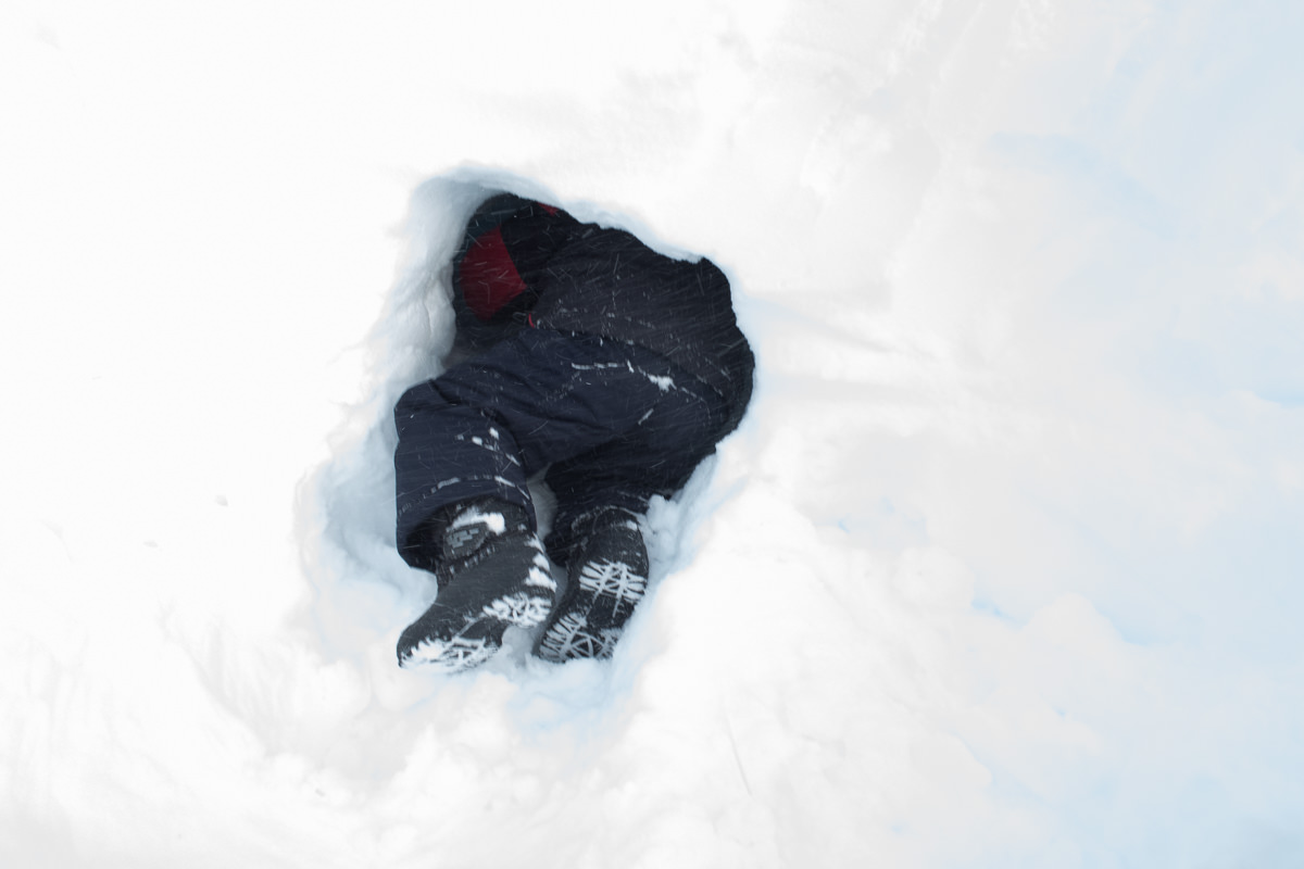 At the lake we stopped to eat our lunch. The wind was brutal, and a few of us took refuge behind the hill. I took the chance to dig a promised snow cave for my son. he had asked for one two weeks earlier and I was fulfilling the promise. The cave was only miniature, but so is he!