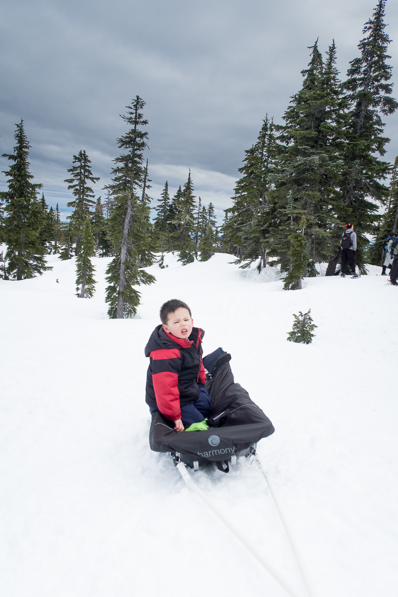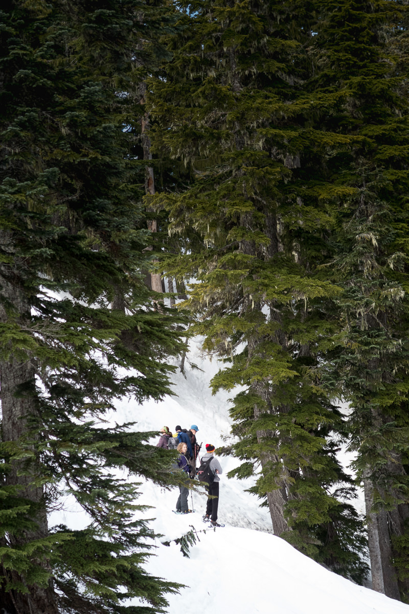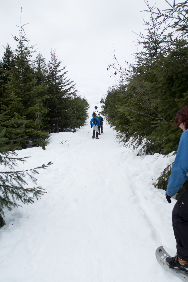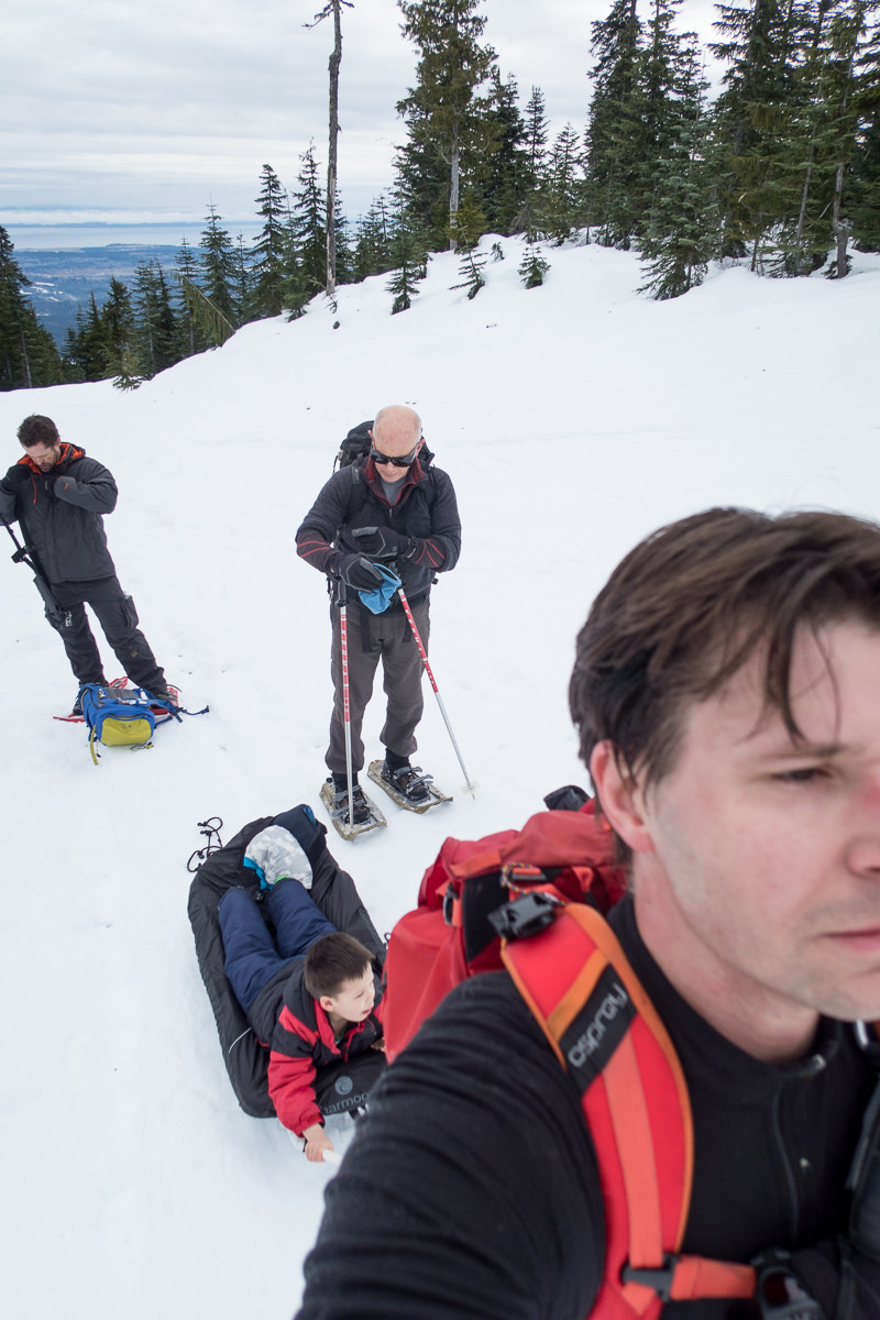 It was just after 10:00 am when the nine of us stepped past the burnt-out husk of the old Forbidden Plateau ski lodge. Other than Hemingway, we all wore snowshoes, though only for traction. The snow was compact ice that bore our weight easily. I’d love to say that the sled was easy to haul, but in reality, the frozen ground was unforgiving. While the sled glides easily over smooth sections, there weren’t many of them today. For the most part, the lower section of the route was a mess of crisscrossing ski and snowshoe tracks.