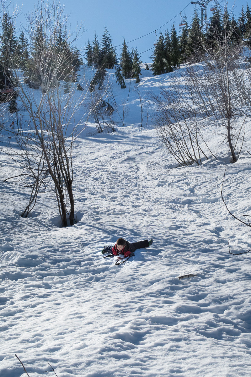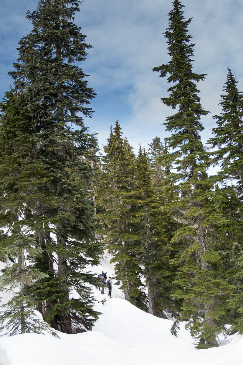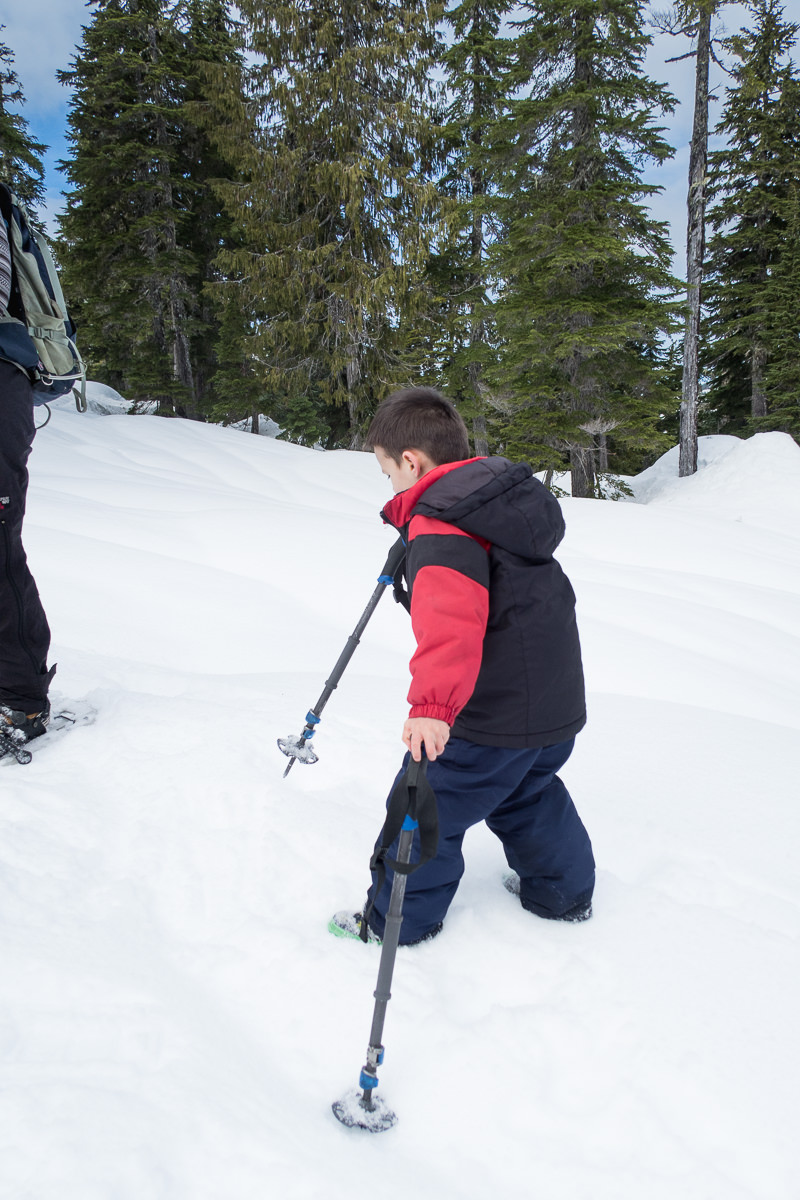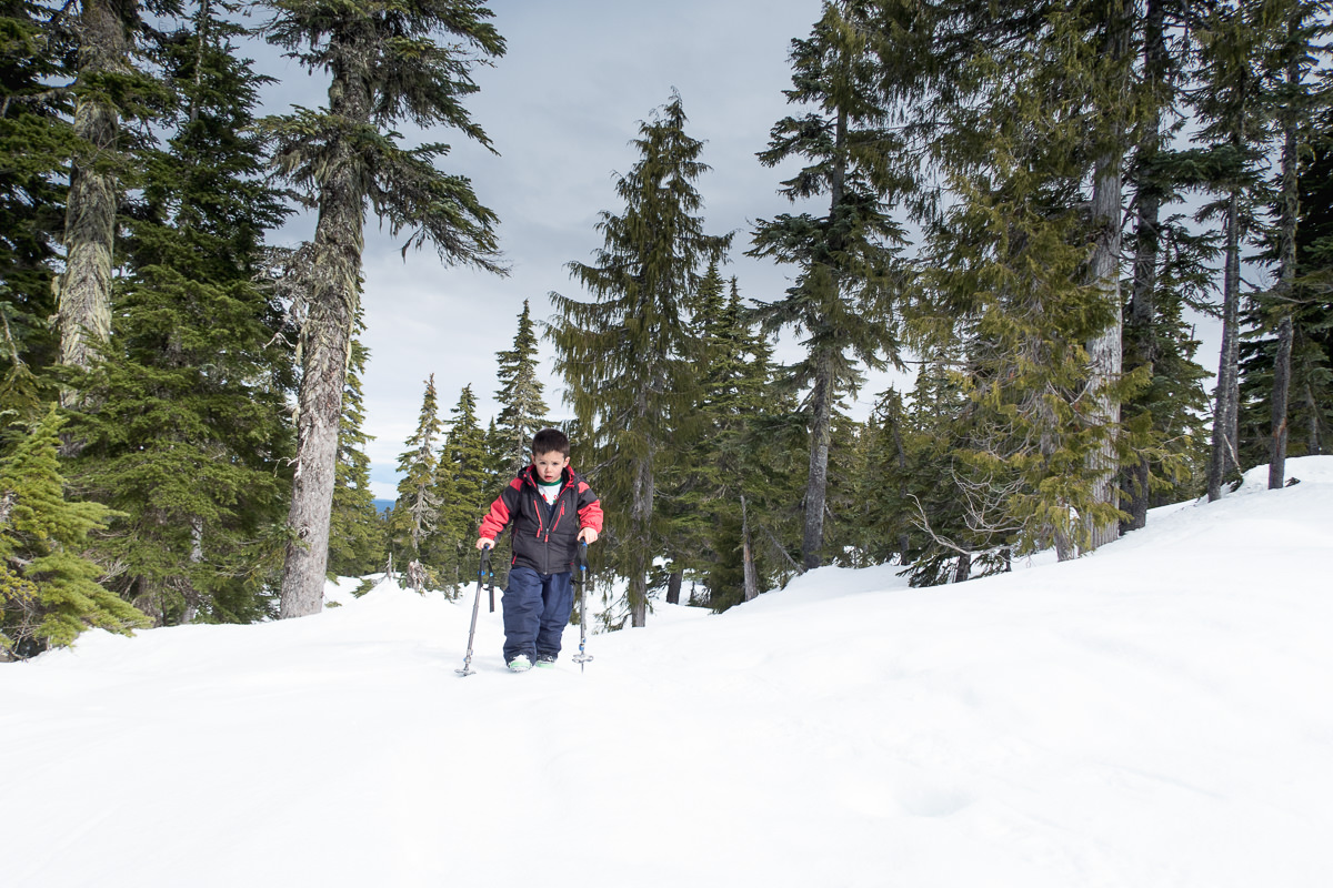 It was just after 10:00 am when the nine of us stepped past the burnt-out husk of the old Forbidden Plateau ski lodge. Other than Hemingway, we all wore snowshoes, though only for traction. The snow was compact ice that bore our weight easily. I’d love to say that the sled was easy to haul, but in reality, the frozen ground was unforgiving. While the sled glides easily over smooth sections, there weren’t many of them today. For the most part, the lower section of the route was a mess of crisscrossing ski and snowshoe tracks.