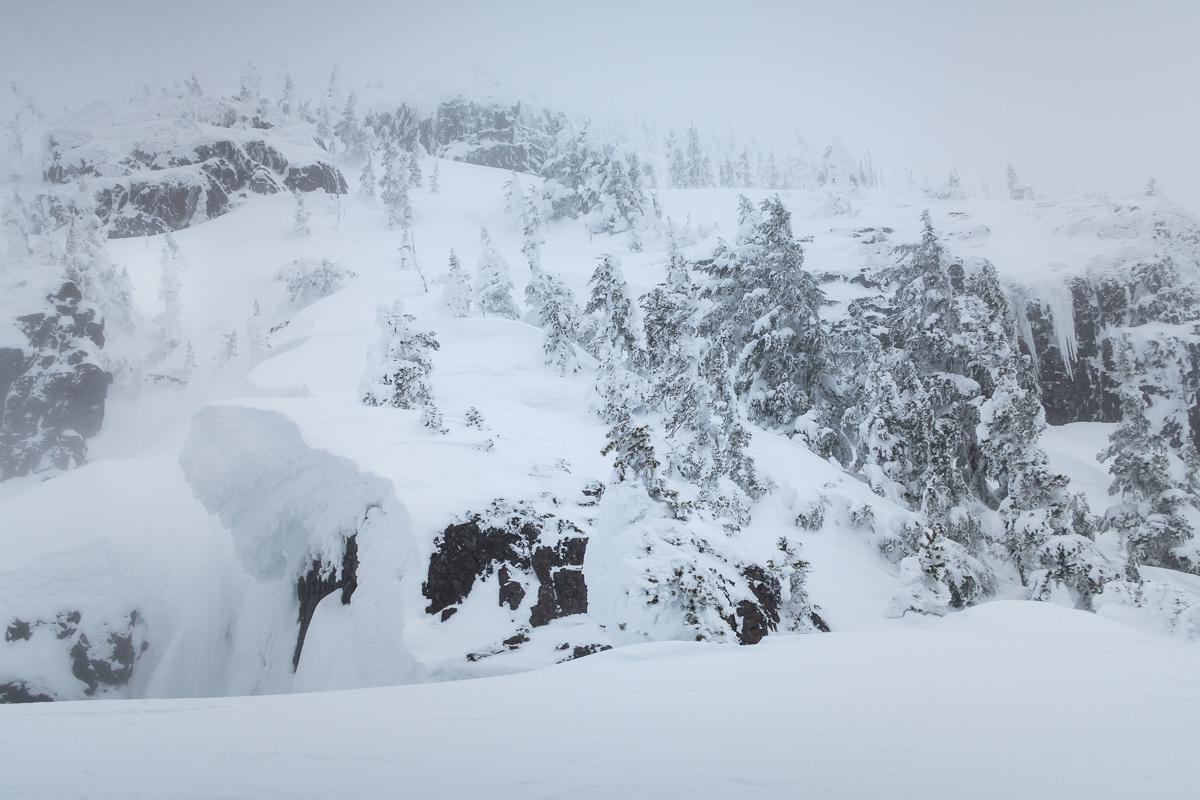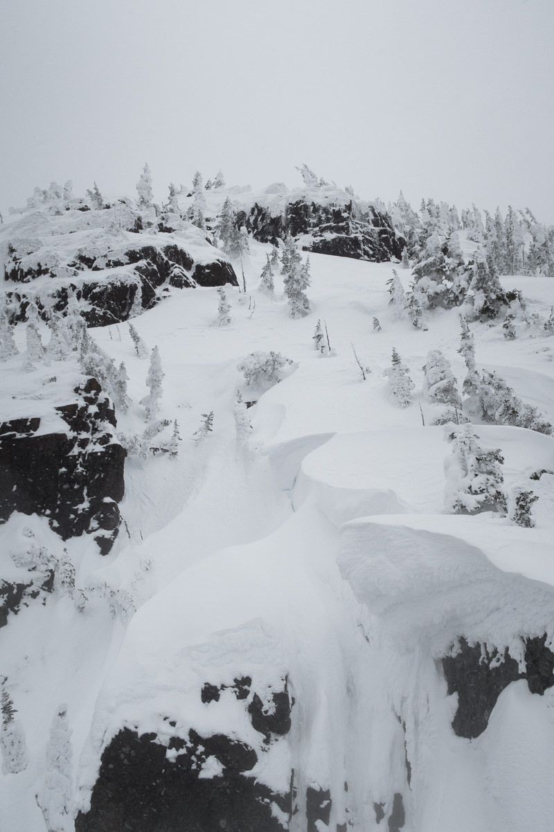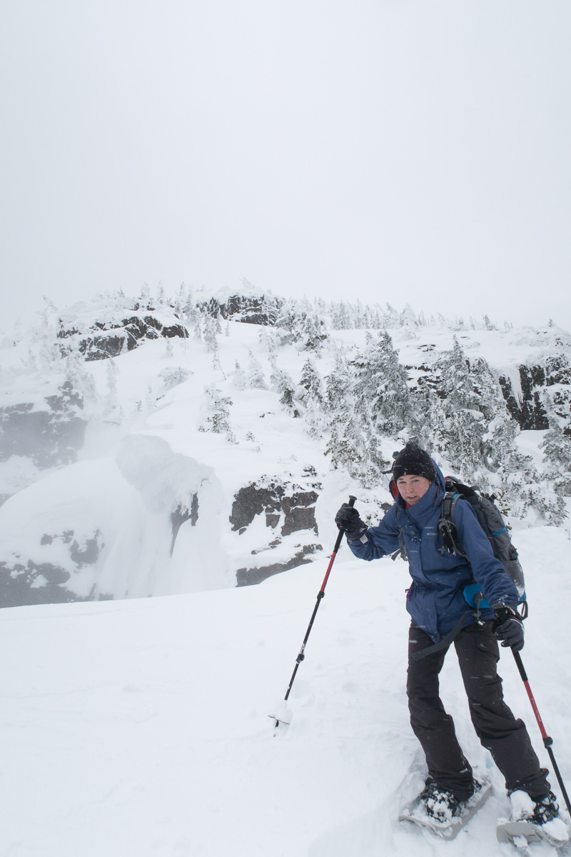 This final push was where we met our biggest challenge. A wicked wind kicked up, driving snow into our eyes and chilling our hands. My ski goggles were a welcome tool today, as were the multiple pairs of gloves. Fortunately, the snow conditions were fine enough in most places; but in one particularly exposed area, the wind left only a skiff of snow atop iced-up rocks. The trouble, of course, is the exposure to our left. If our footing gave out, it was a short runout to a long drop into a gully — death for sure. We took our time to carefully place snowshoes, and when we were each atop the short, challenging section, it was a straight shot to the summit.