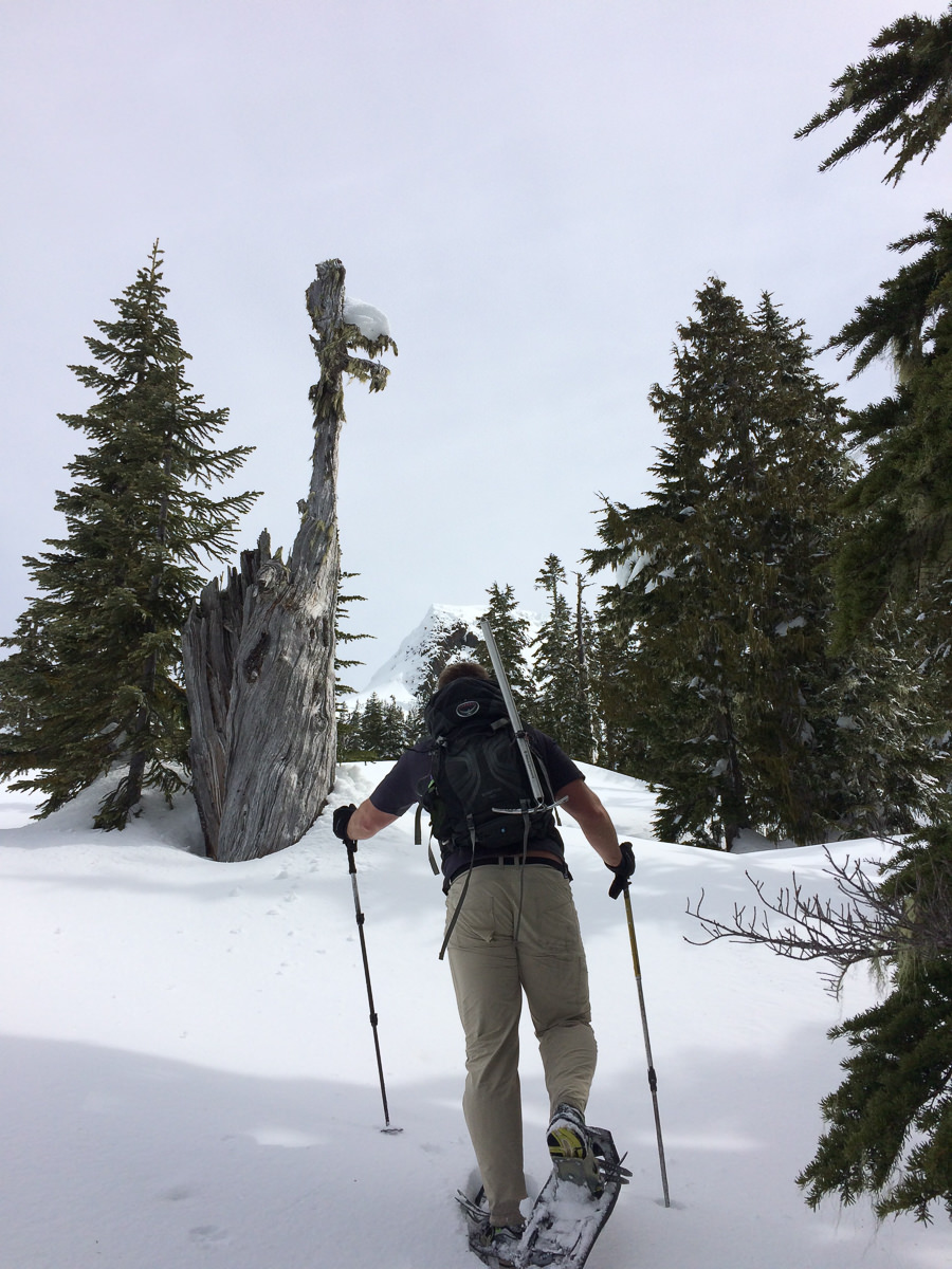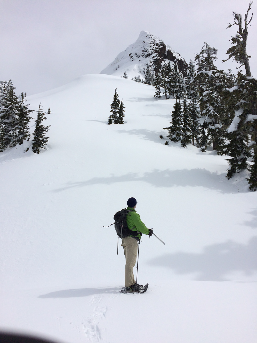 Sunday morning was cool, but not freezing. We woke, packed camp, ate homemade French toast cooked on a pocket rocket (an impressive feat for sure), and we were back at the trailhead by 9:00 am. We left the vehicles behind us and continued on snowshoes under patchy skies. The route starts along the logging road, gaining elevation slowly along the decrepit old logging grade. After an easy creek crossing and another short section of alder-filled logging grade, we found ourselves at the base of a slide, both snow and washout (this is noted as the gully on the GPS track).