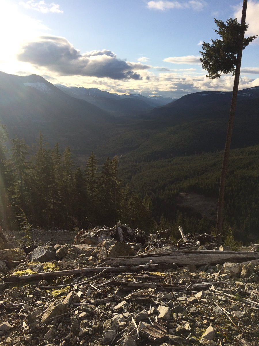 At the top of the road, we exited the Jeep on a landing. We stood in awe as we overlooked the Nimkish River Valley; from our vantage point, we could see thirty-five kilometres down the valley. The evening sun was casting its golden-orange hues on the landscape, creating a moment that demonstrated one hard fact: I needed this trip. I hadn’t understood that fact prior to being there in the moment, but now it was obvious. We opened some beverages, stared down the valley, and talked, watching the wind in the trees.