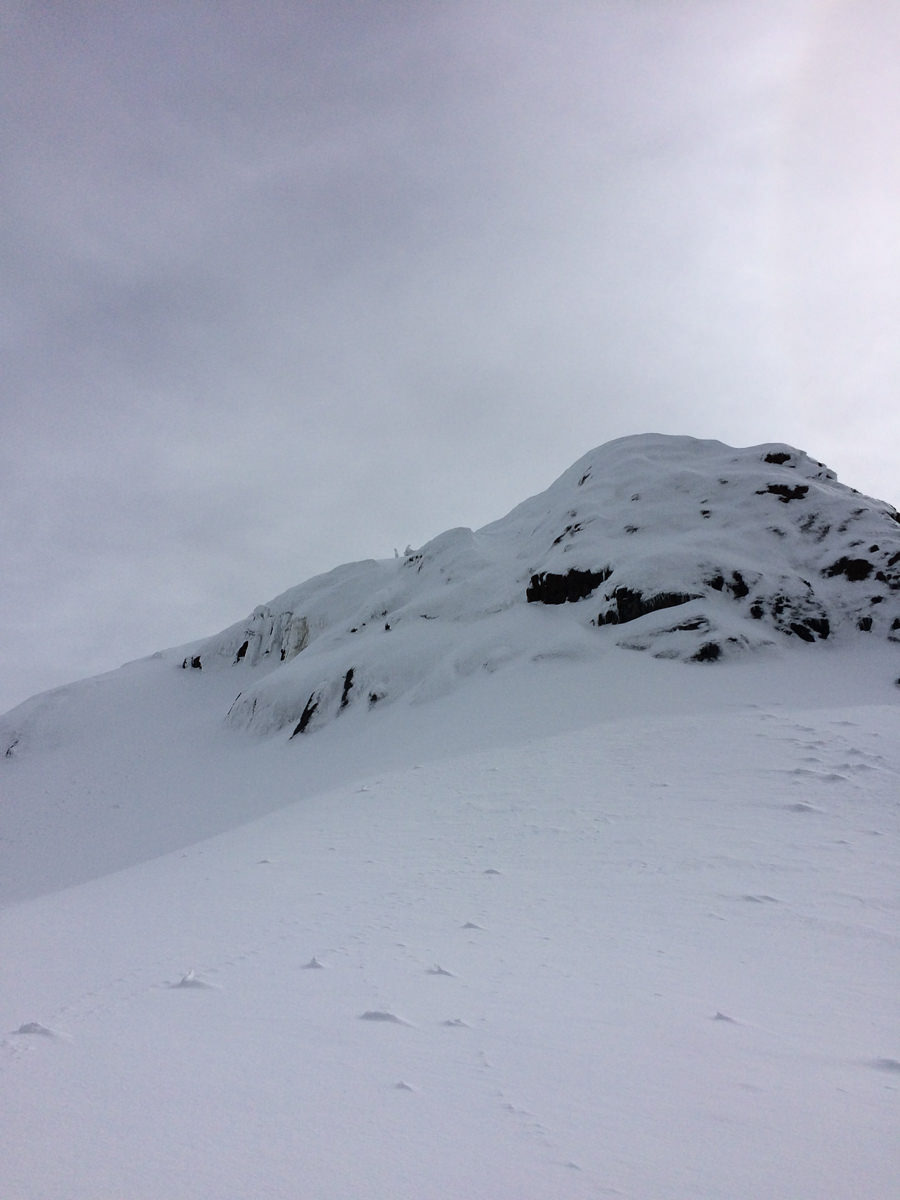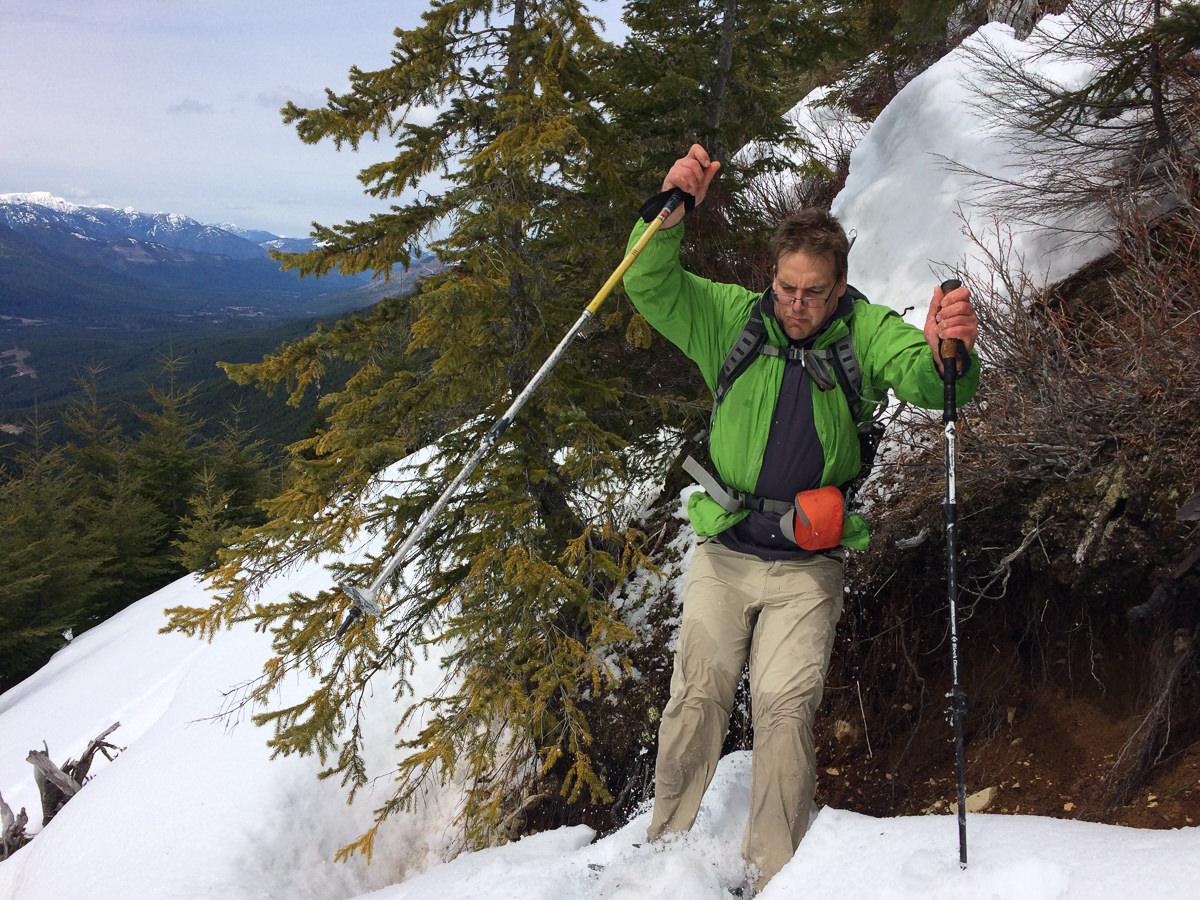As Phil and I waited for the other two, who were taking an extended break around 1000 metres elevation, I pulled out my snow probe and starting testing the snow depth and looking for rain crusts. At 1400 metres there’s still over 240 cm of snow, but the real surprise was the ice crusts. I could only find four crusts, and the layers between were all of similar density. When our friends joined us, we ate lunch and continued up the slope in front of us to the shoulder, only 50 metres below the summit. It’s here that we faltered.